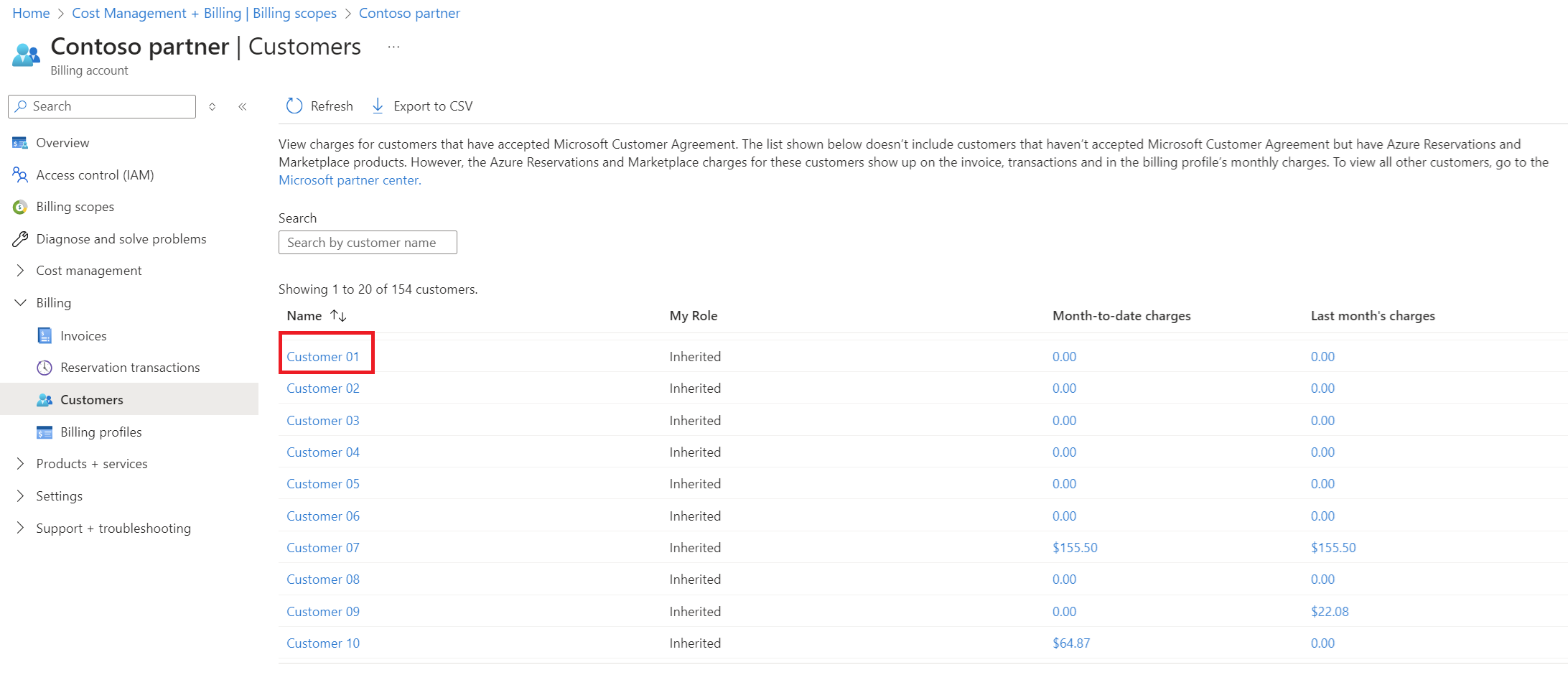 You can view and manage customers that accepted a Microsoft Customer Agreement and have an Azure Plan in the Azure portal. You can view charges and transactions as well as create and manage Azure subscriptions for these customers.
