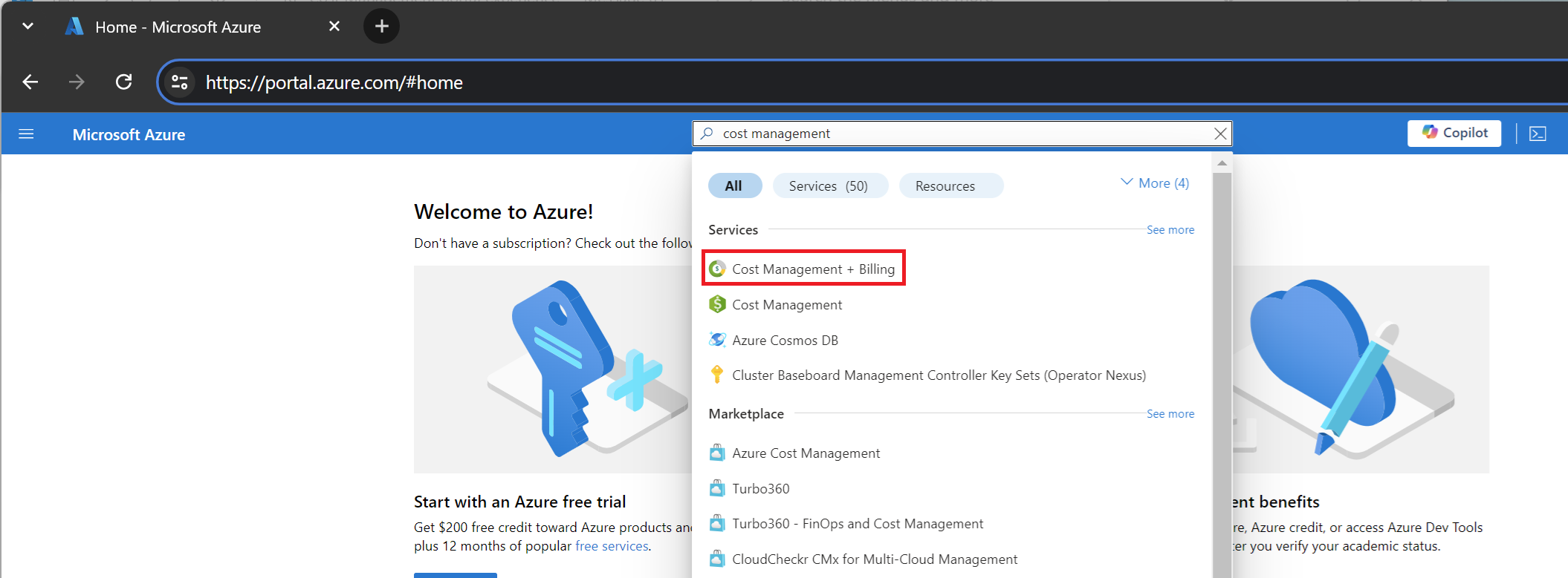 - Sign in to the Azure portal with your partner credentials and search for Cost Management + Billing.