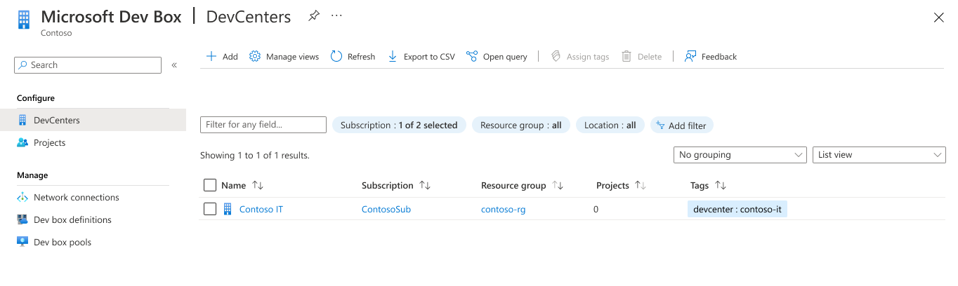 2. In the search box, enter dev box. In the list of results, select Dev centers.