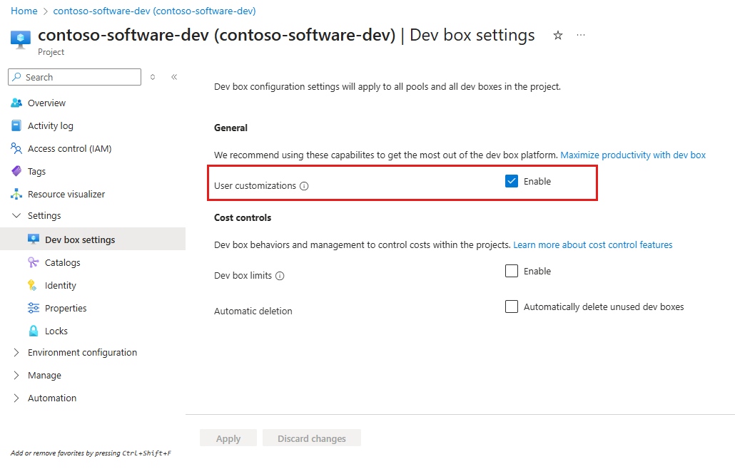 User customizations are controlled at the project level and are enabled by default. You can disable them during or after project creation. When disabled, developers can't apply their own customization files to new dev boxes. Enabling user customizations doesn't bypass existing project guardrails; developers can only use tasks provided in the attached catalog and can't run tasks with elevated privileges unless an administrator has explicitly included an administrative task in the catalog.