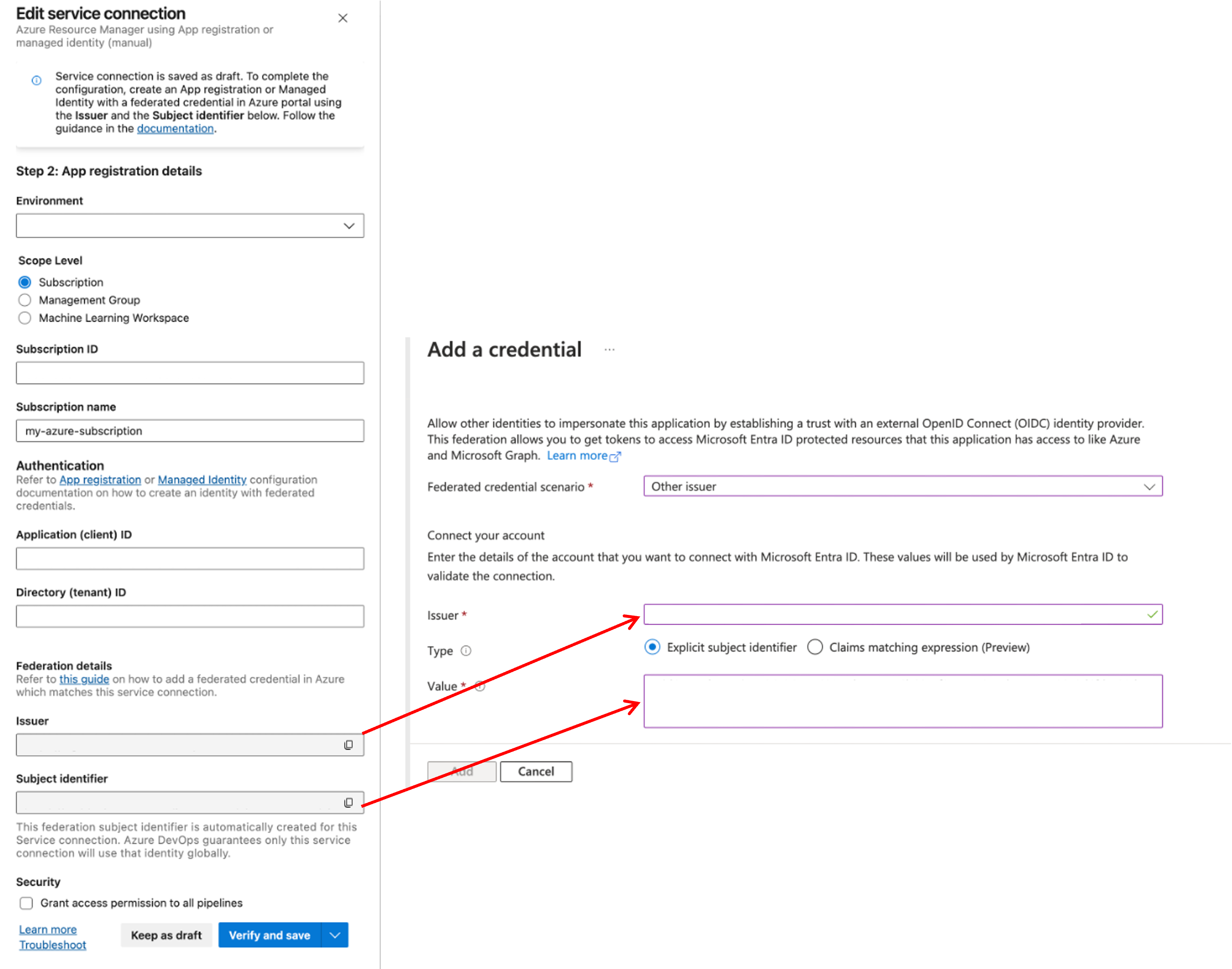 Paste the values for Issuer and Subject identifier that you copied from your Azure DevOps project into your federated credentials in the Azure portal. For Type, select Explicit subject identifier.