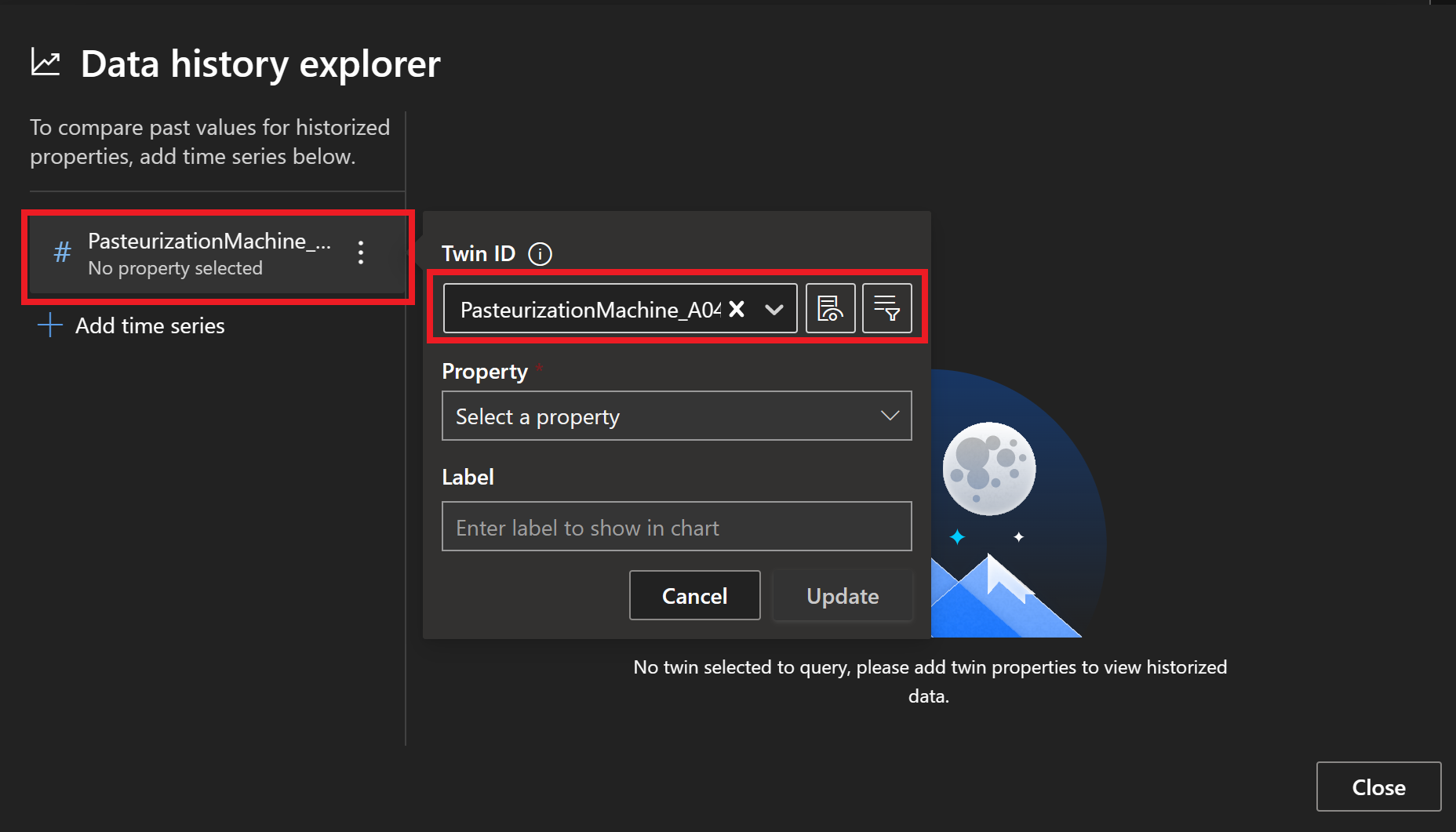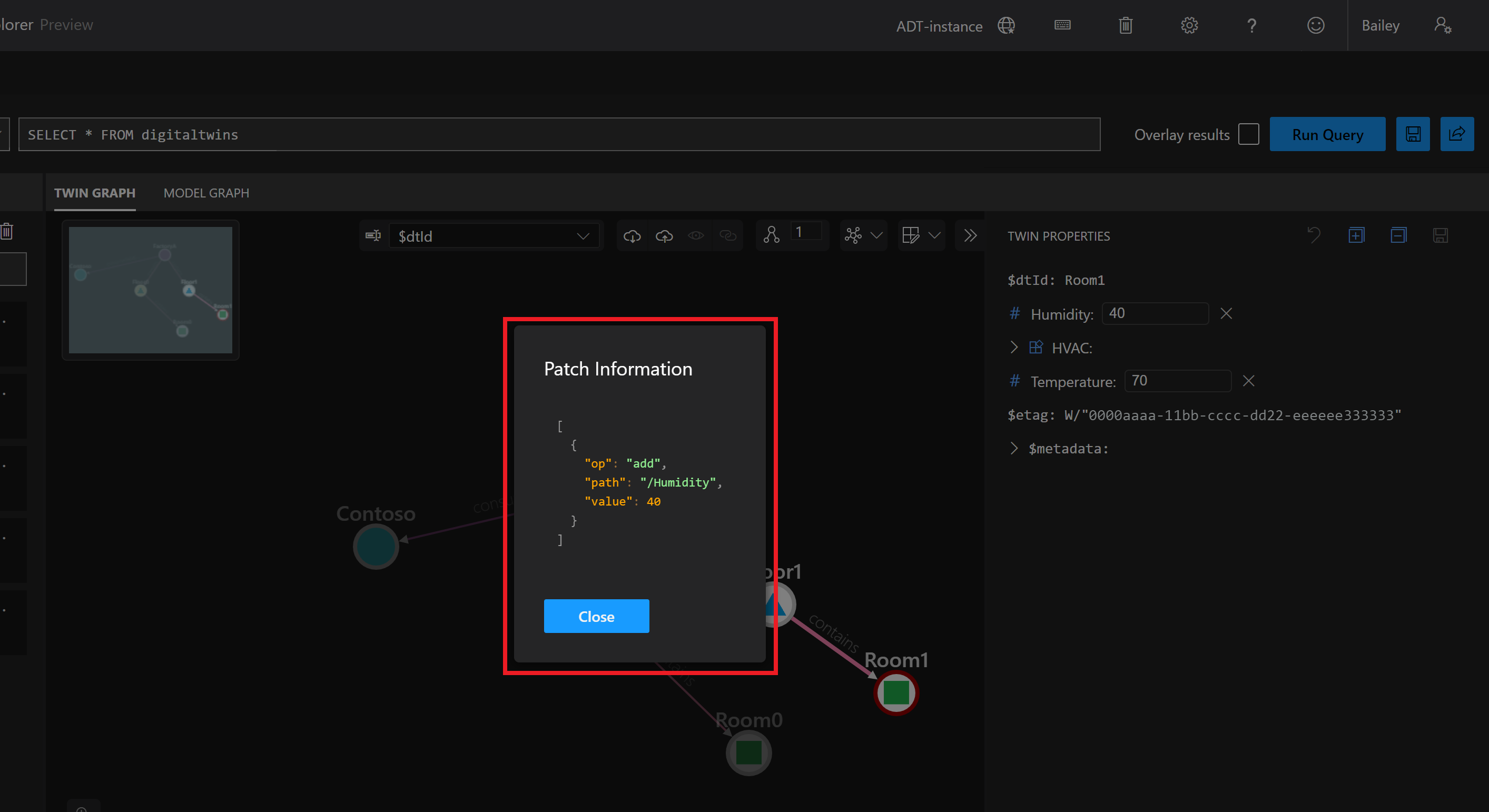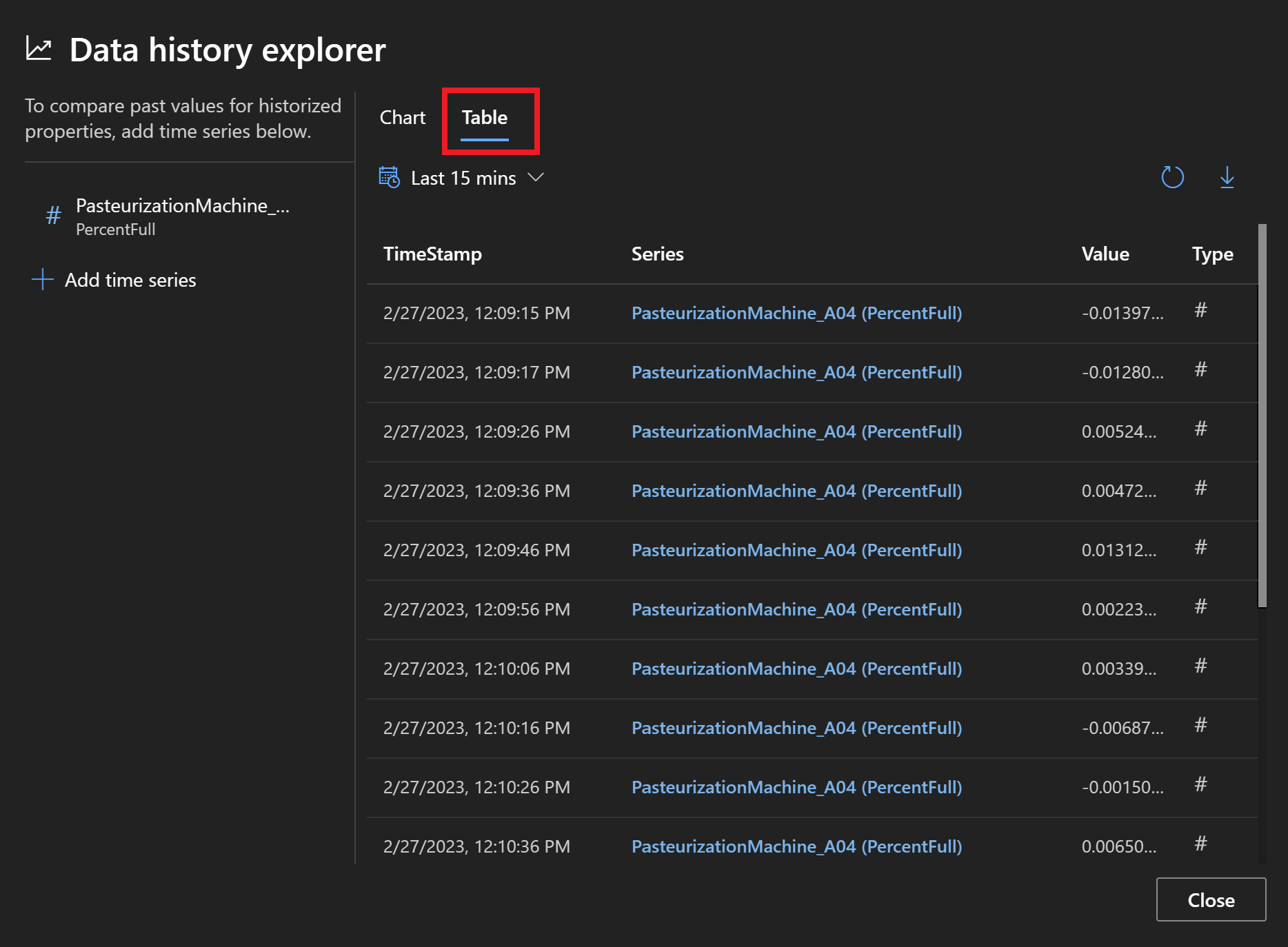 To exit the data history explorer and return to the main Azure Digital Twins Explorer, select Close.