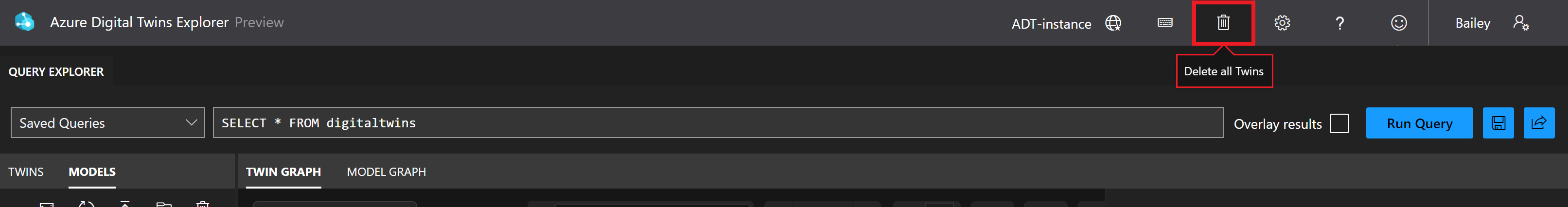 - Caching: When this feature is enabled, Azure Digital Twins Explorer keeps a local cache of relationships and models in memory to improve query performance. These caches are cleared on any write operations on the relevant elements, and also on browser refresh. This feature is off by default.