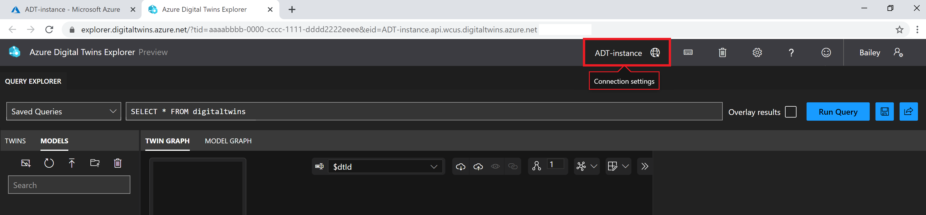 Then, share this URL to allow someone to access your instance. When they open Azure Digital Twins Explorer with the link, they're connected to your instance and can't see any prepopulated query results.