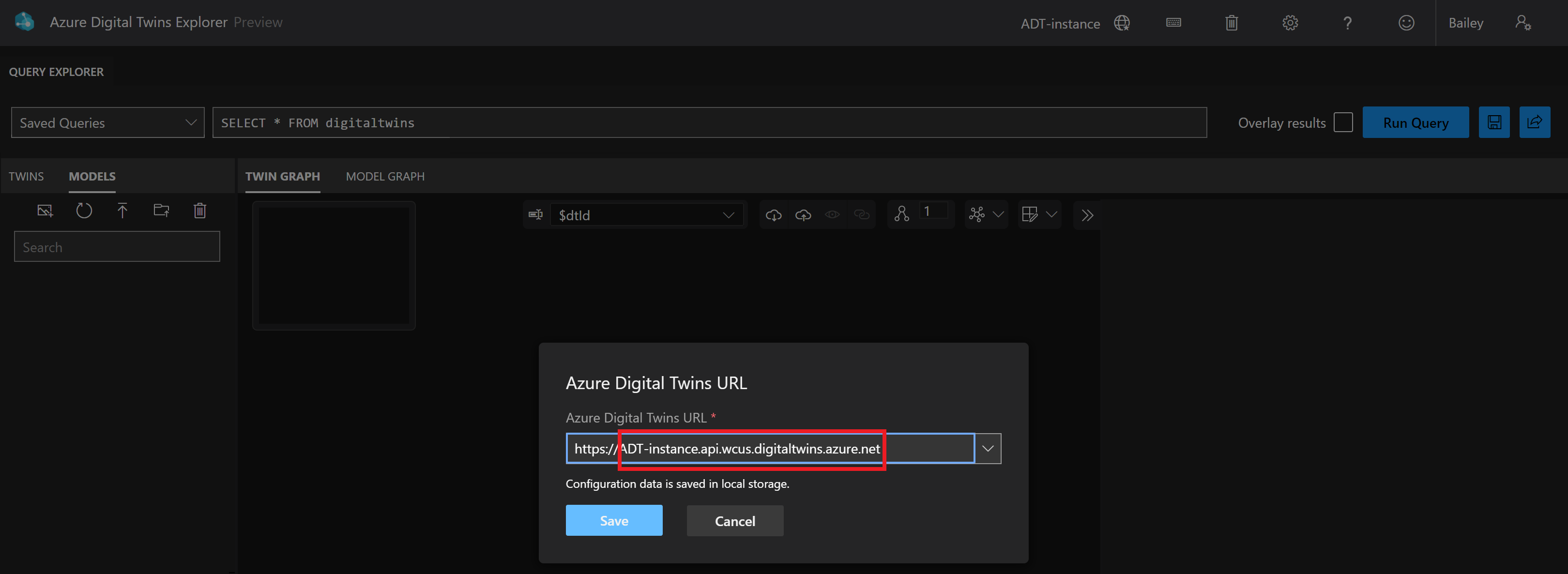 Doing so will bring up the Azure Digital Twins URL modal, where you can enter the host name of another Azure Digital Twins instance after the https:// prefix to connect to that instance.