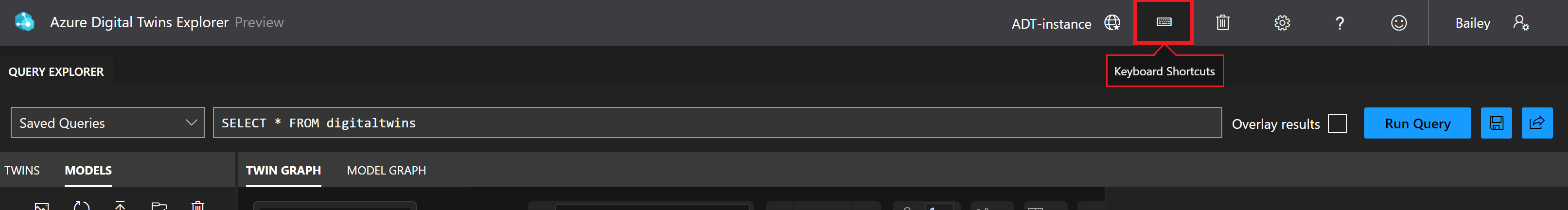 You can use the Keyboard Shortcuts icon in the top-right toolbar to view a list of keyboard shortcuts that can be used to navigate the Azure Digital Twins Explorer.