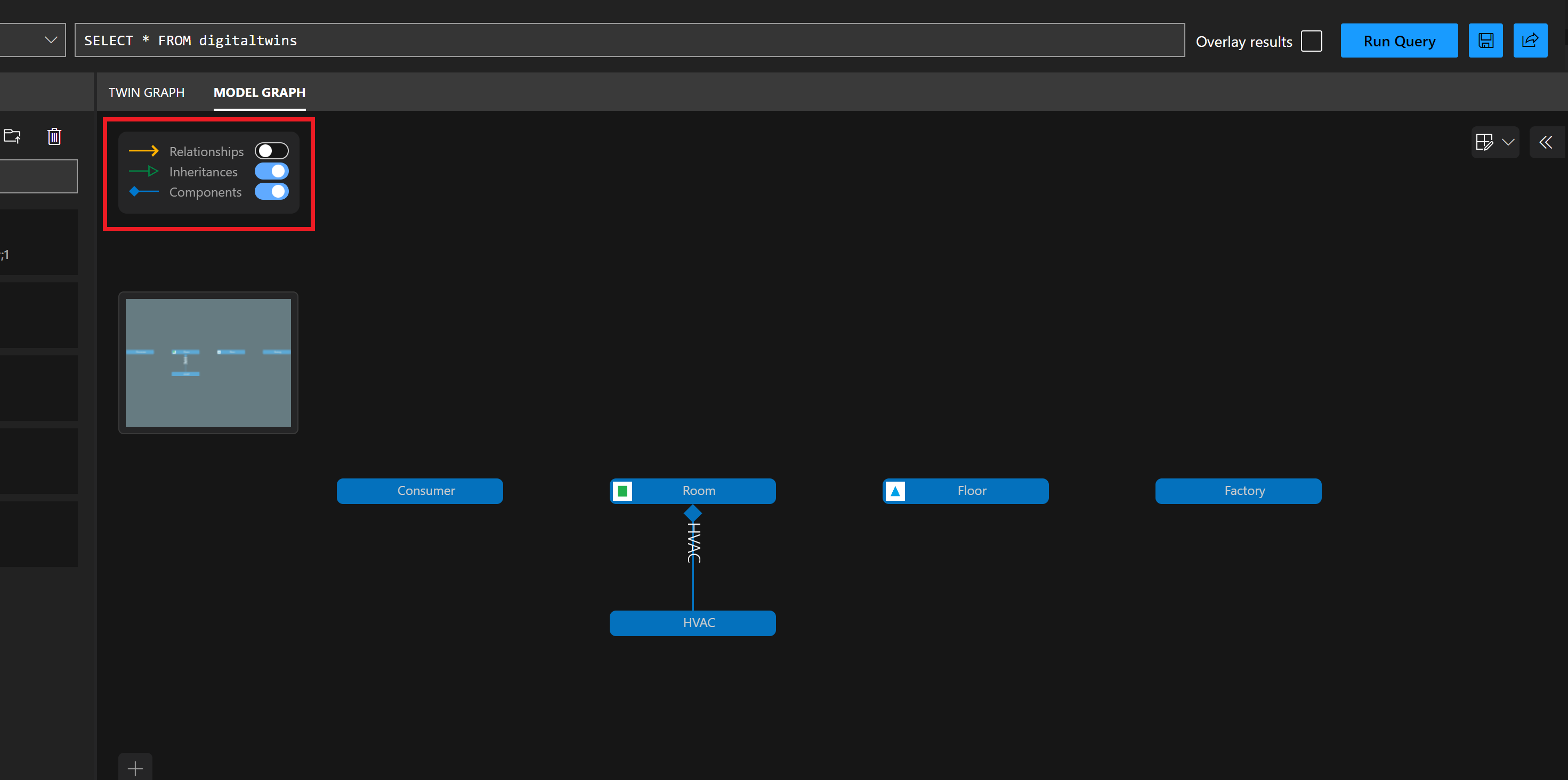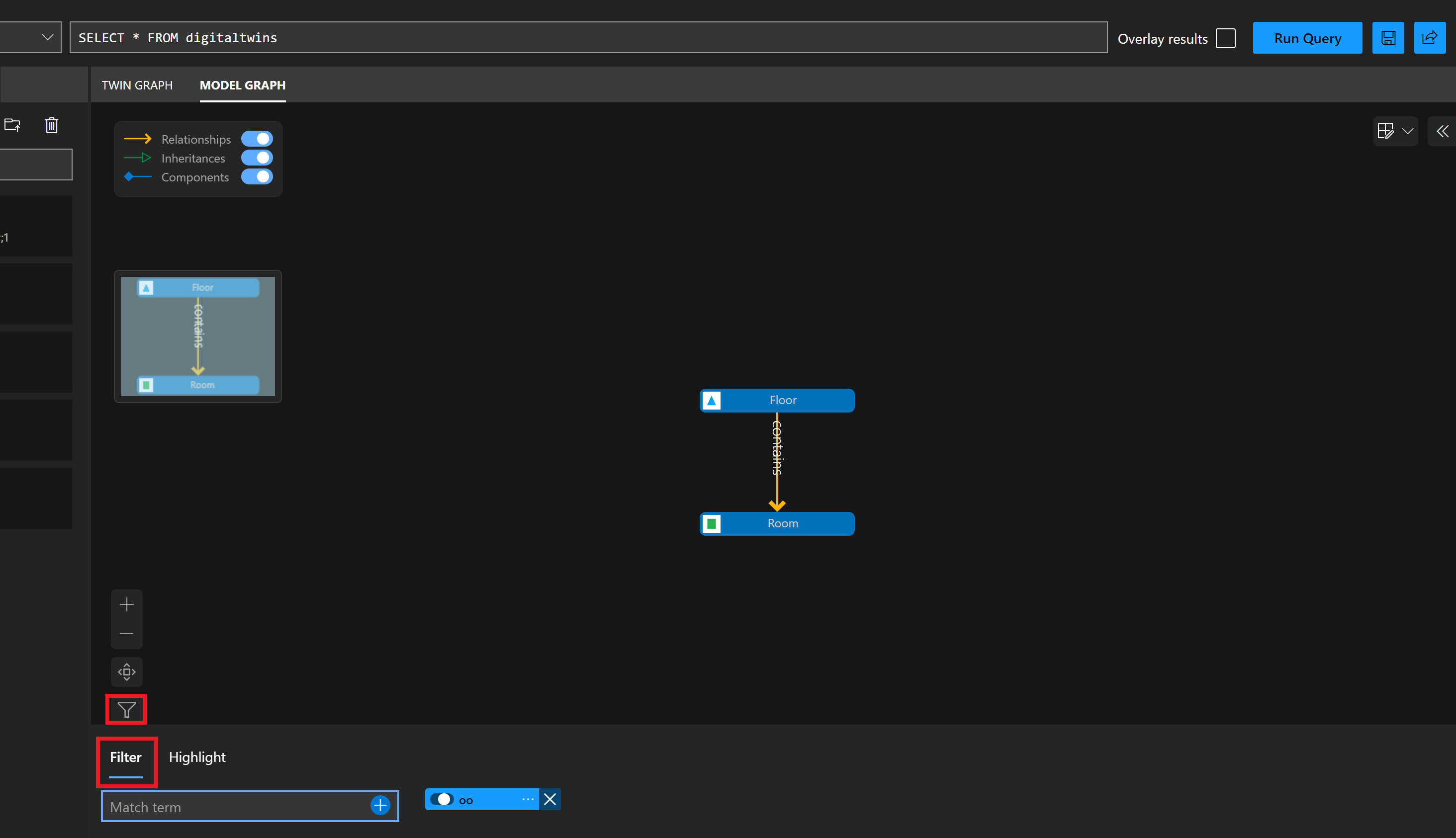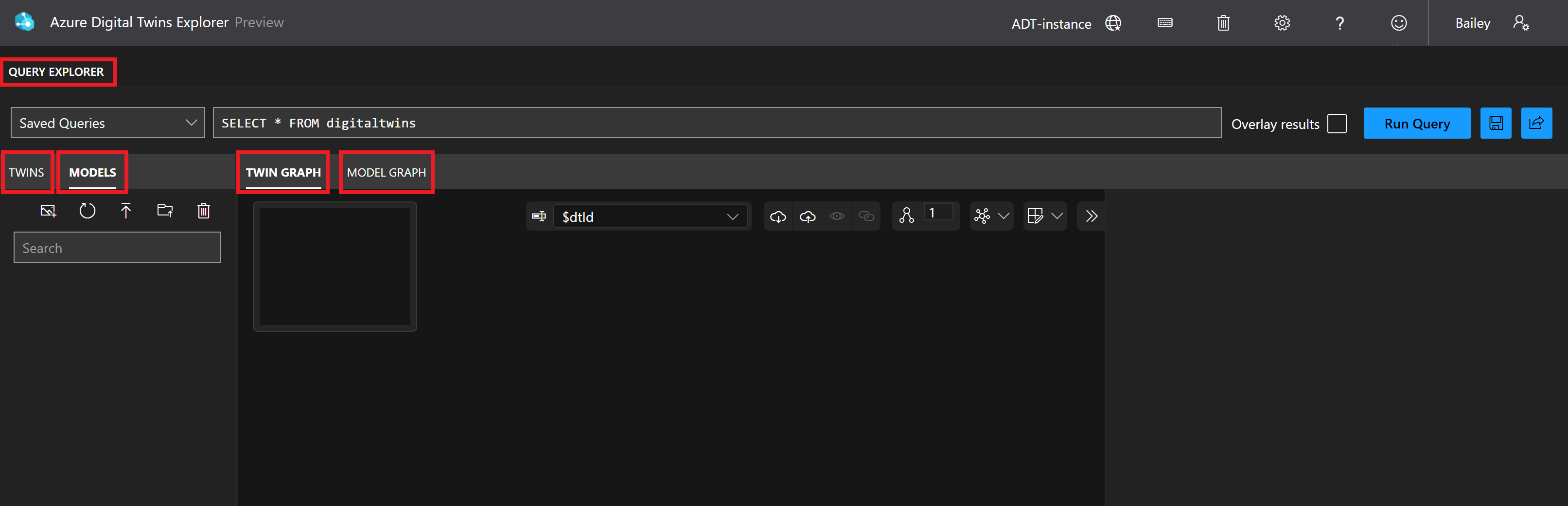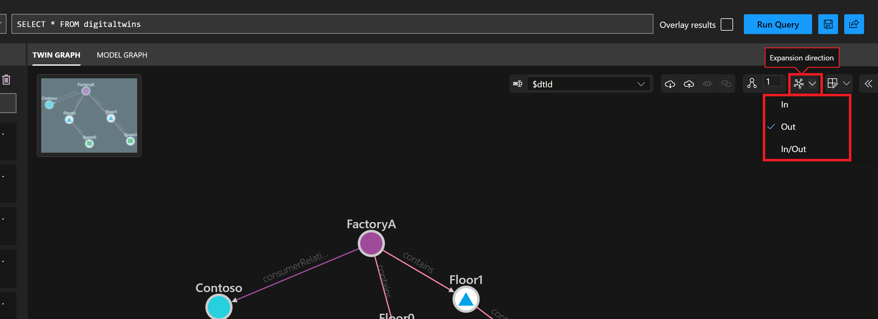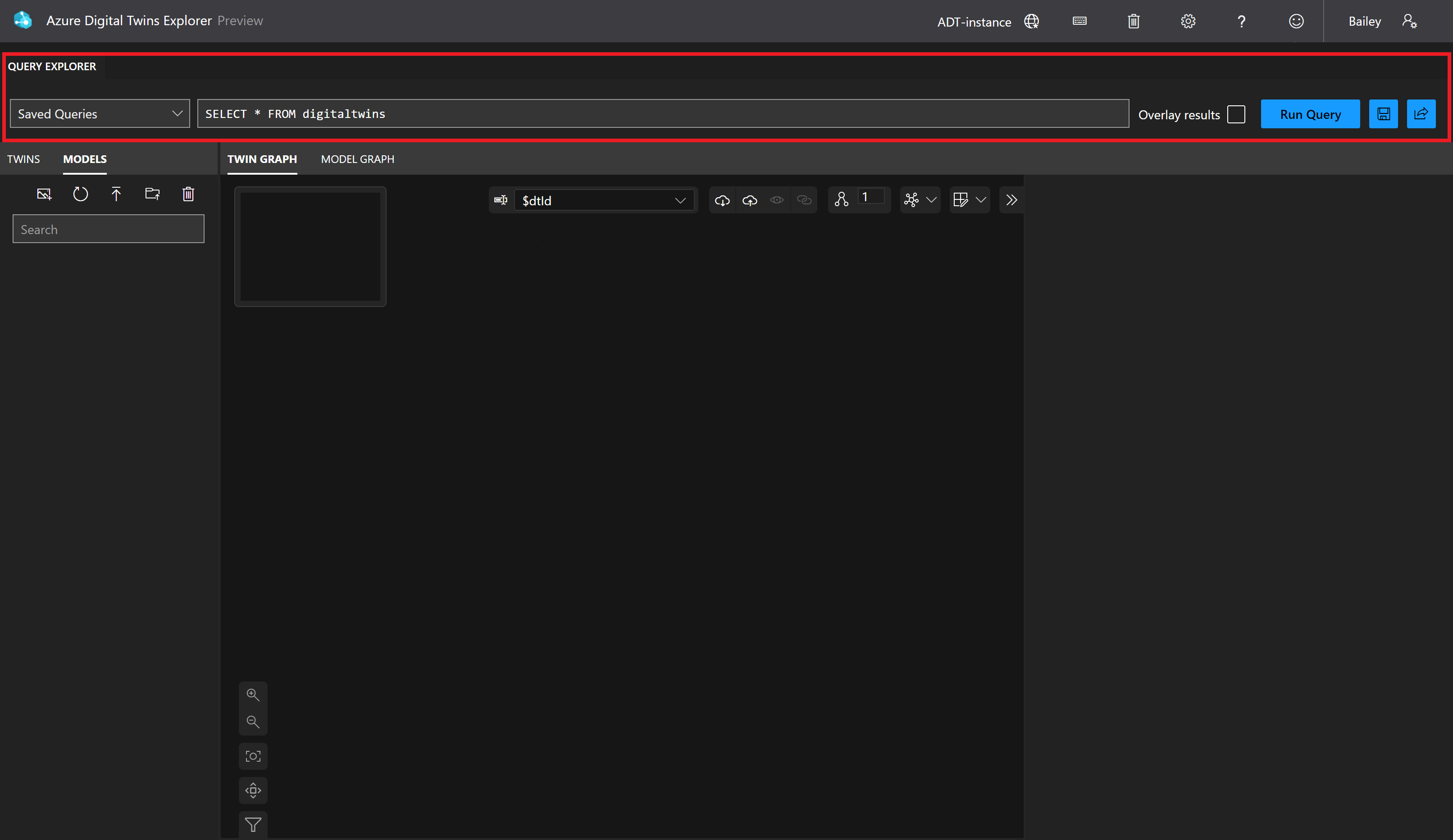 To begin, use the Query Explorer panel to run a query that selects the twins and relationships that you want to download. Doing so populates them in the Twin Graph panel.