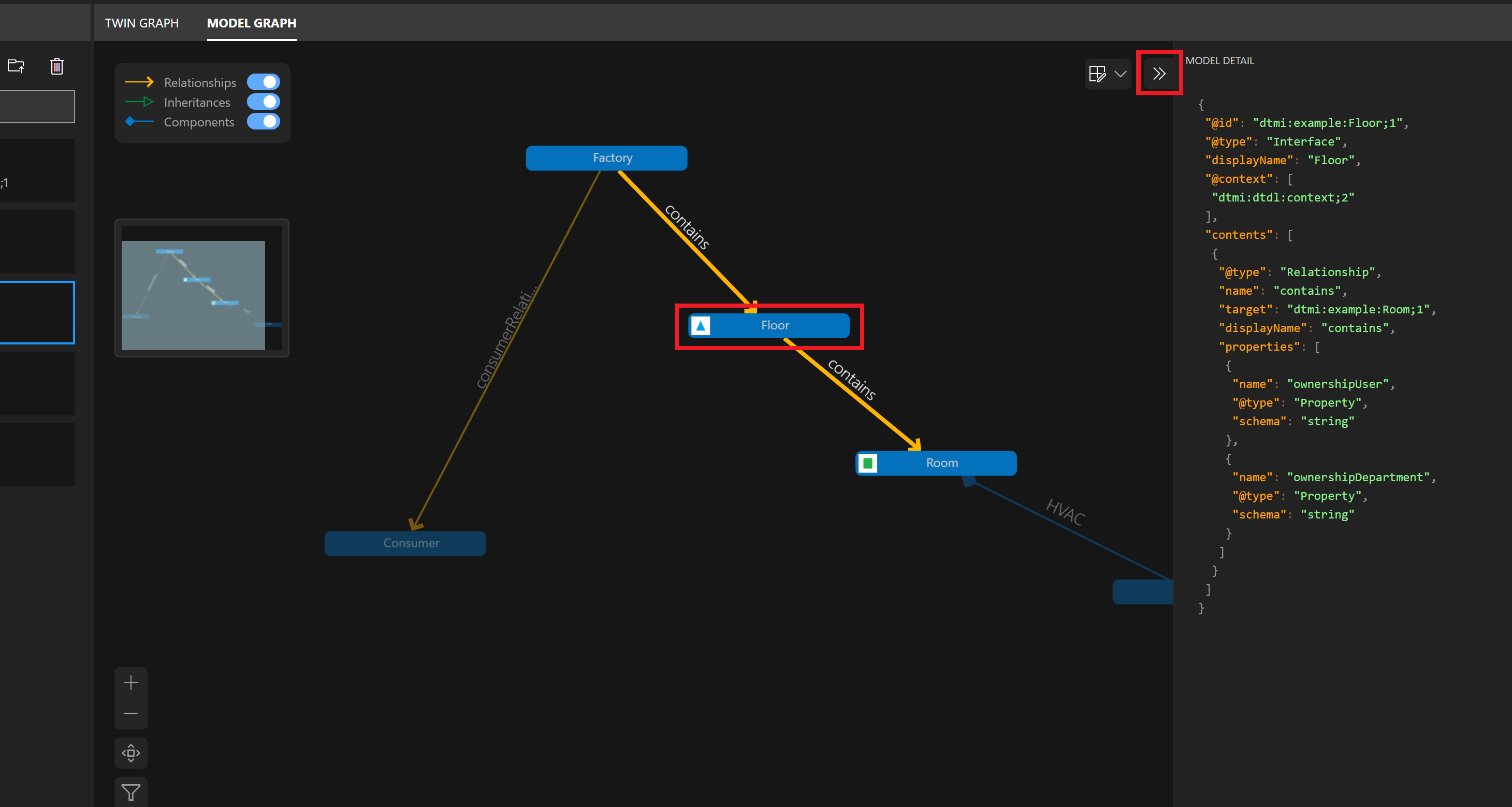 Right-click a twin in the graph, and choose Get relationships. Doing so brings up a Relationship Information modal displaying the JSON representation of all incoming and outgoing relationships.