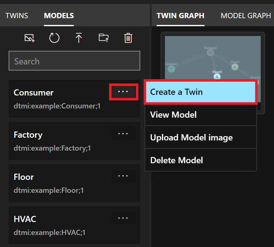 You can use the Models panel on the left side of the Azure Digital Twins Explorer screen to perform management activities on the entire set of models, or on individual models.