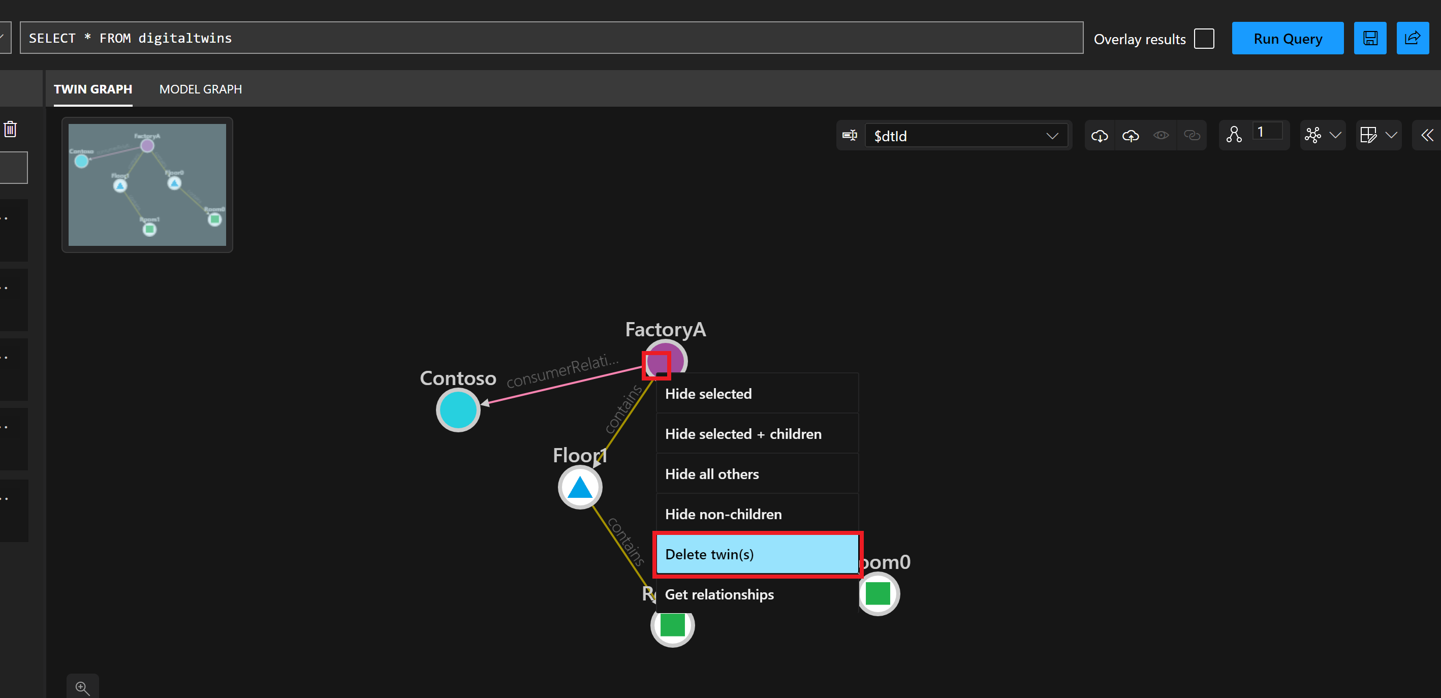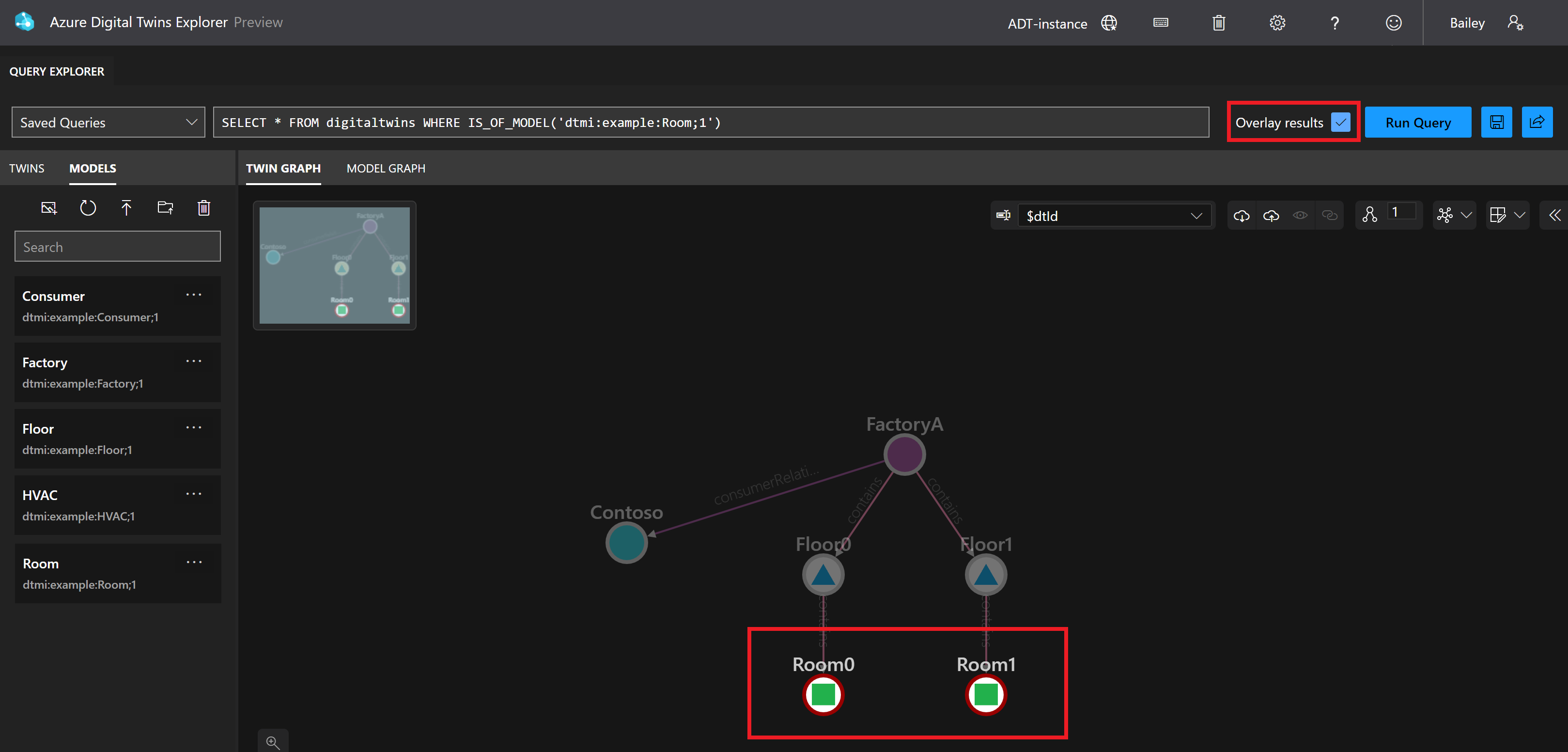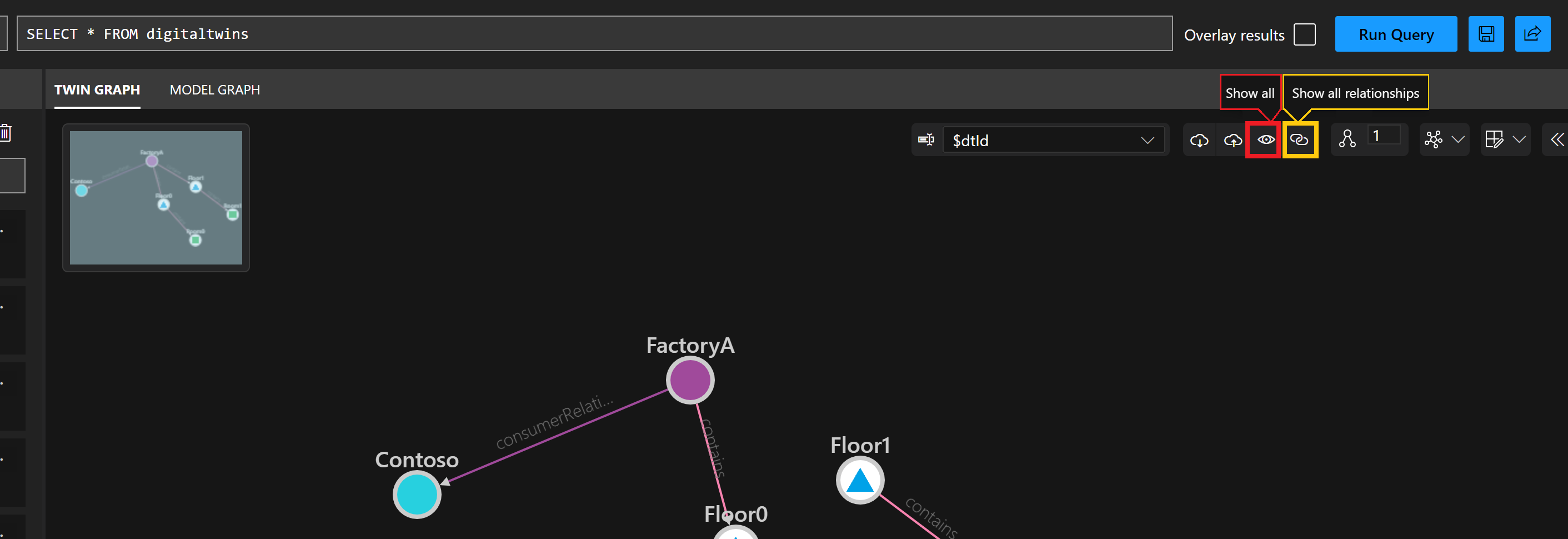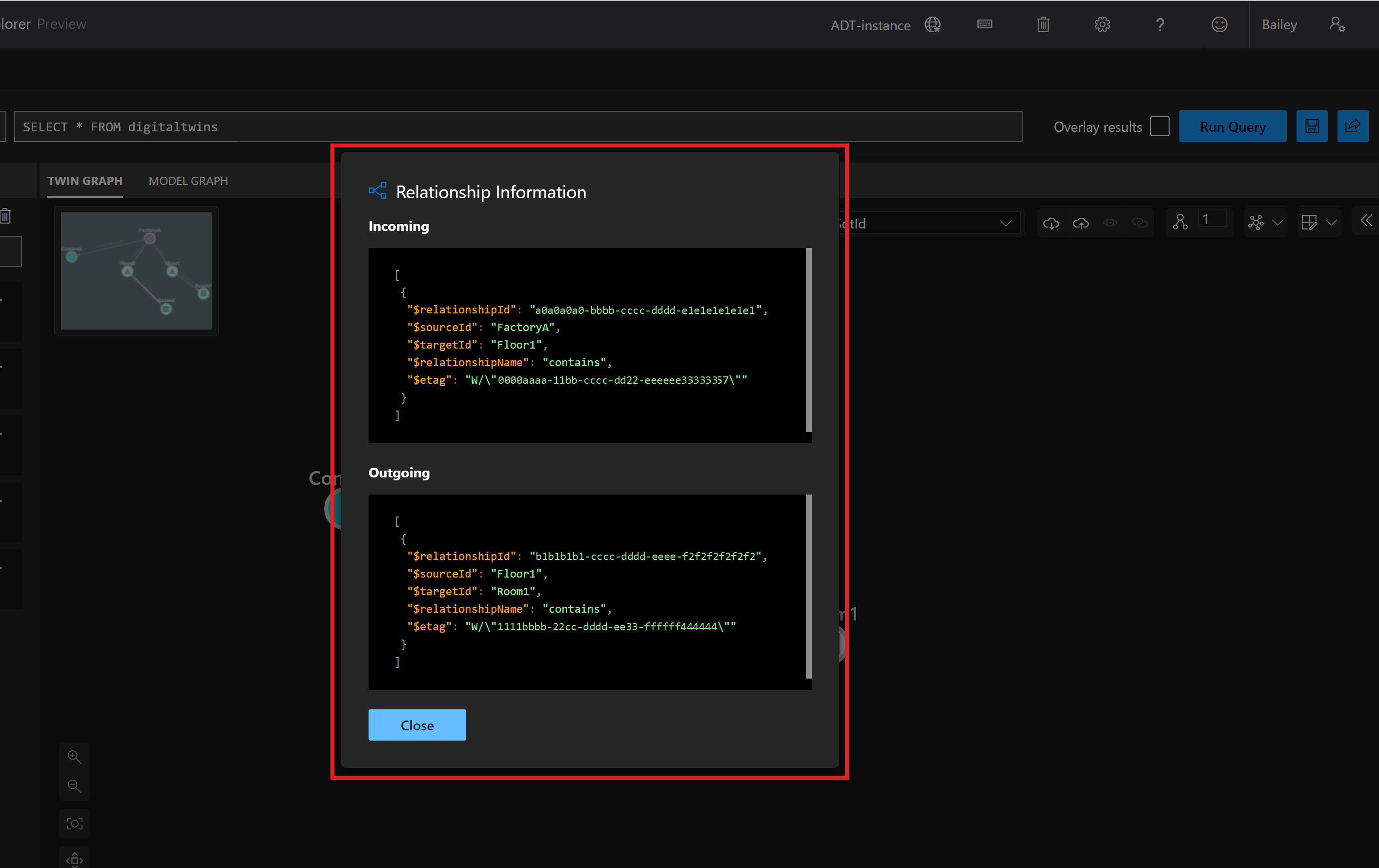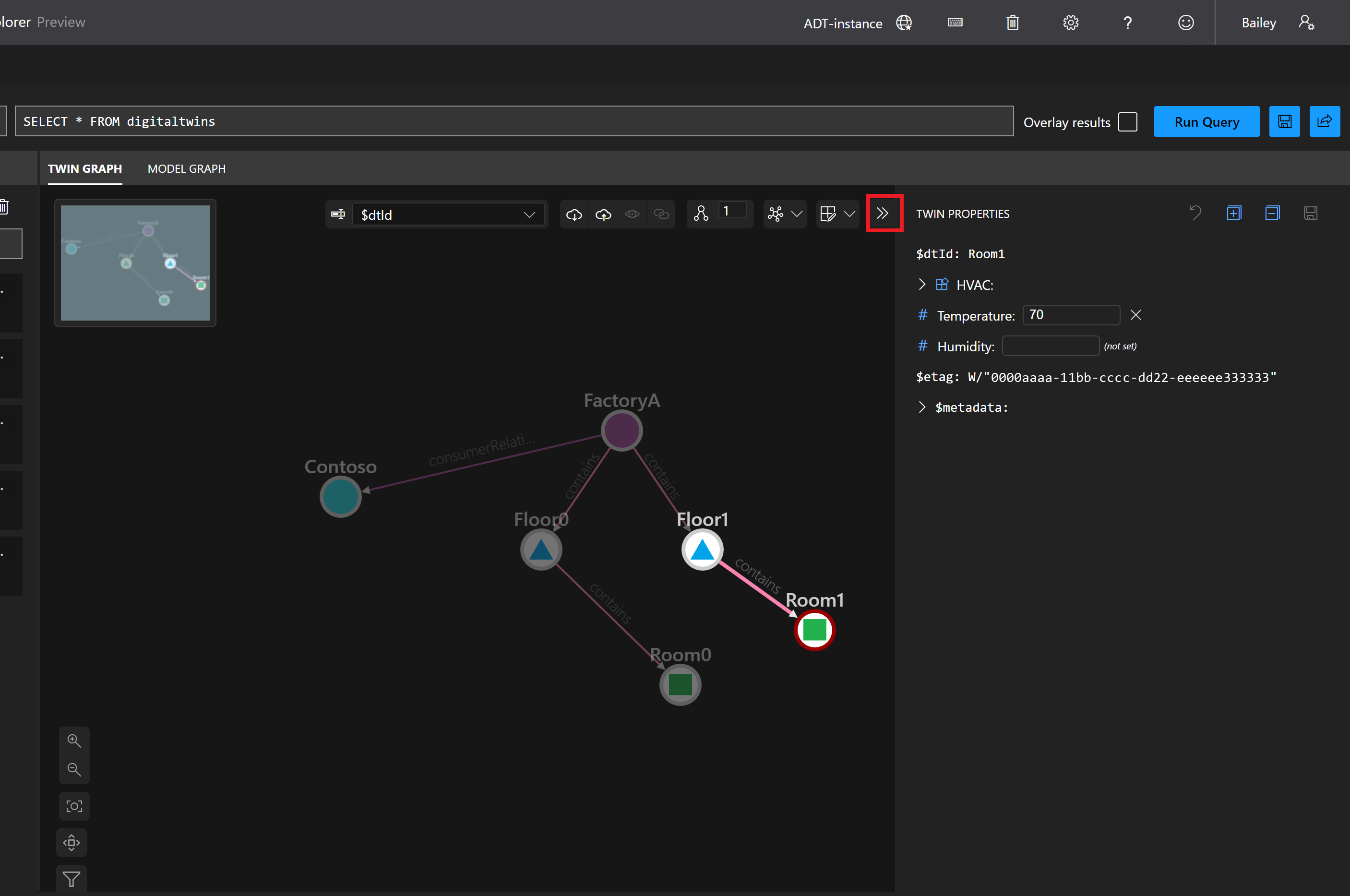 Run a query using the Query Explorer to see the twins and relationships in the query result displayed in the Twin Graph panel.