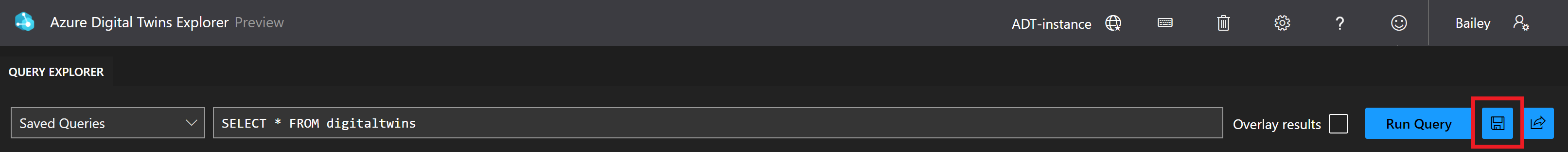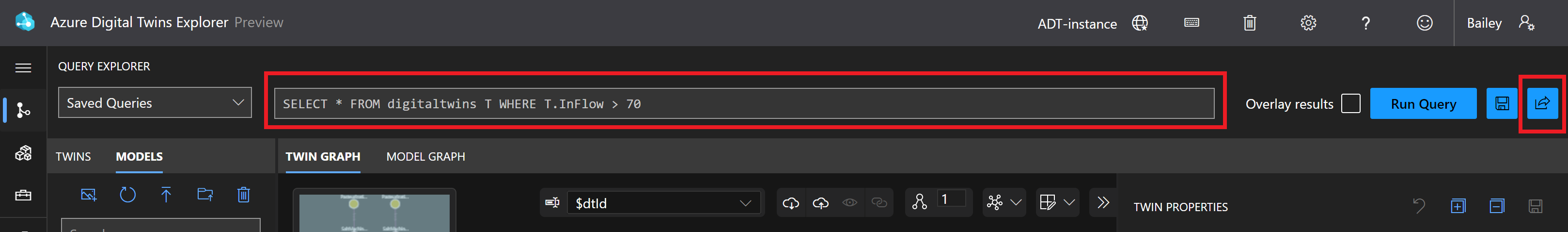 To generate a link to your Azure Digital Twins Explorer environment that includes a specific query, enter the query you want to capture in the Query Explorer, then select the Share button to copy the full link.