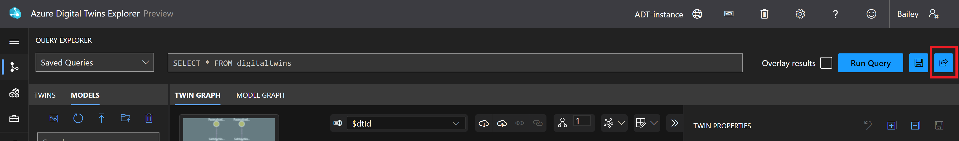 To share a link to your Azure Digital Twins Explorer environment with no specific query attached, start by using the Share button to copy the link to your instance.