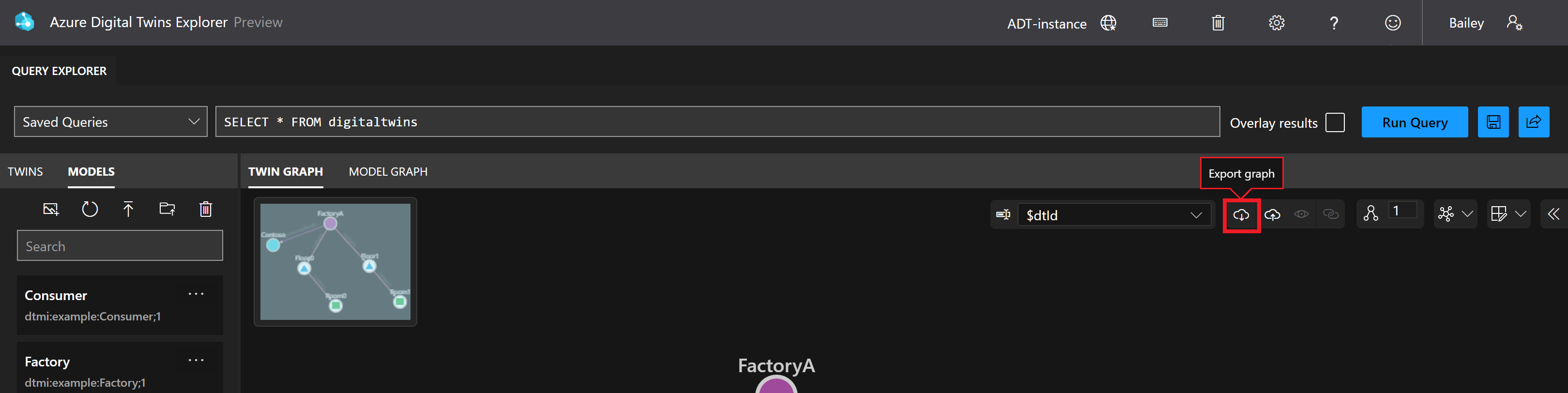 You can use the export feature to export partial or complete graphs, including models, twins, and relationships. Export serializes the twins and relationships from the most recent query results, and all models in the instance, to a JSON-based format that you can download to your machine.