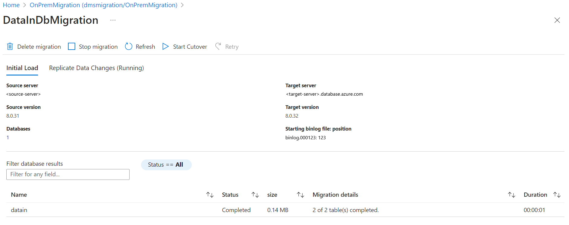 After the Initial Load activity is completed, you're navigated to the Replicate Data Changes tab automatically. You can monitor the migration progress as the screen is auto-refreshed every 30 seconds.