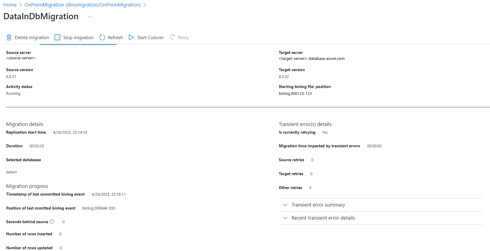 Monitor the Seconds behind source and as soon as it nears 0, proceed to start cutover by navigating to the Start Cutover menu tab at the top of the migration activity screen.