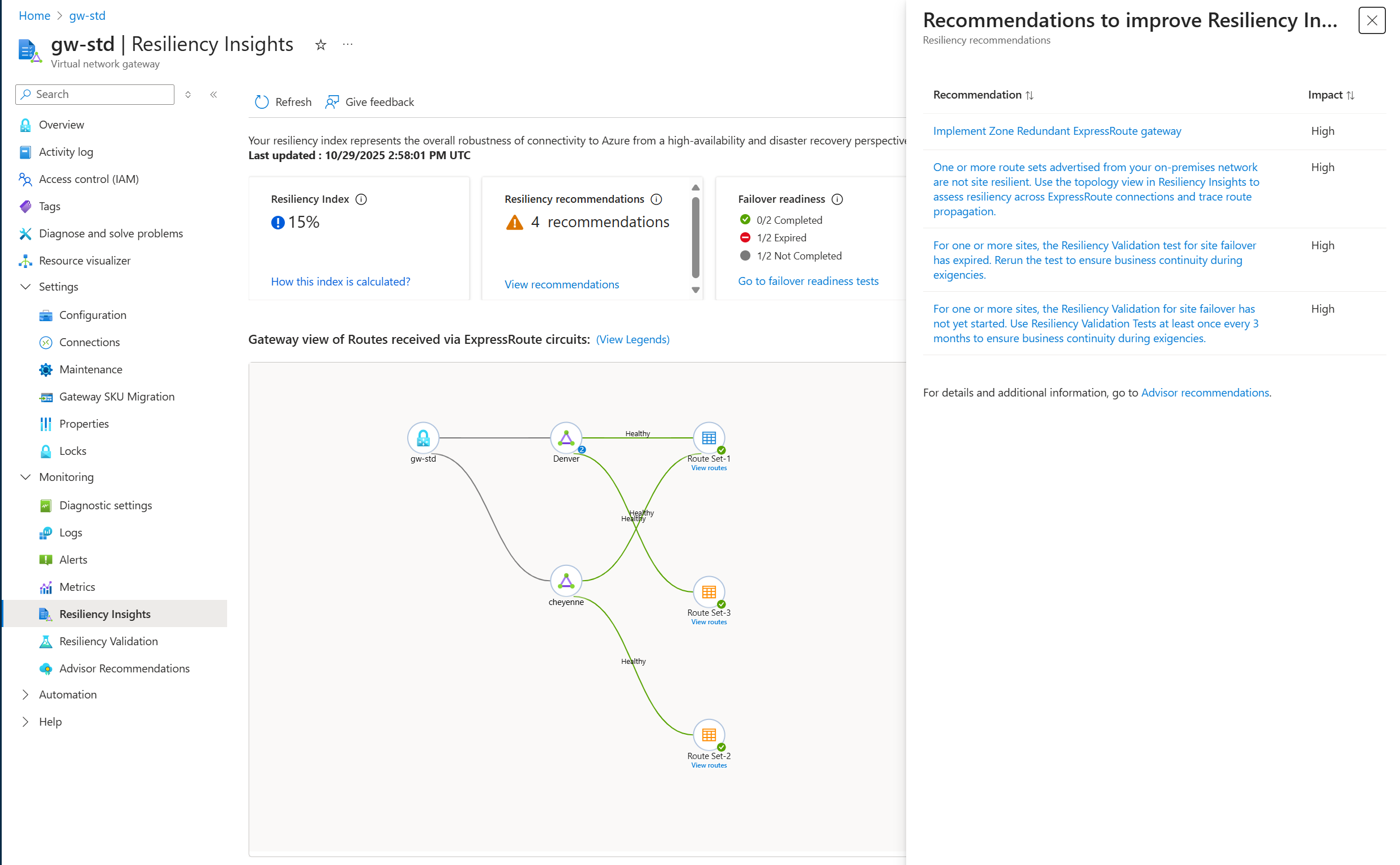 Recommendations to deploy a zone redundant gateway or a multi-site ExpressRoute circuit are already factored into the overall resiliency index score. As a result, they don't affect the advisory recommendations score directly.
