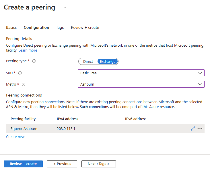 Setting Value Peering type Select Exchange. SKU Select Basic Free. Metro Select the metro location where you want to convert peering to an Azure resource. If you have peering connections with Microsoft in the selected metro location that aren't converted to an Azure resource, they'll be listed in the Peering connections section. Note