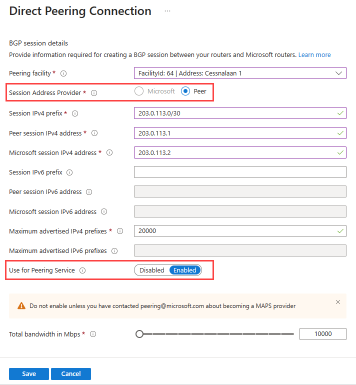 For Direct Peering Connection, enter or select your peering facility details. Then select Save.