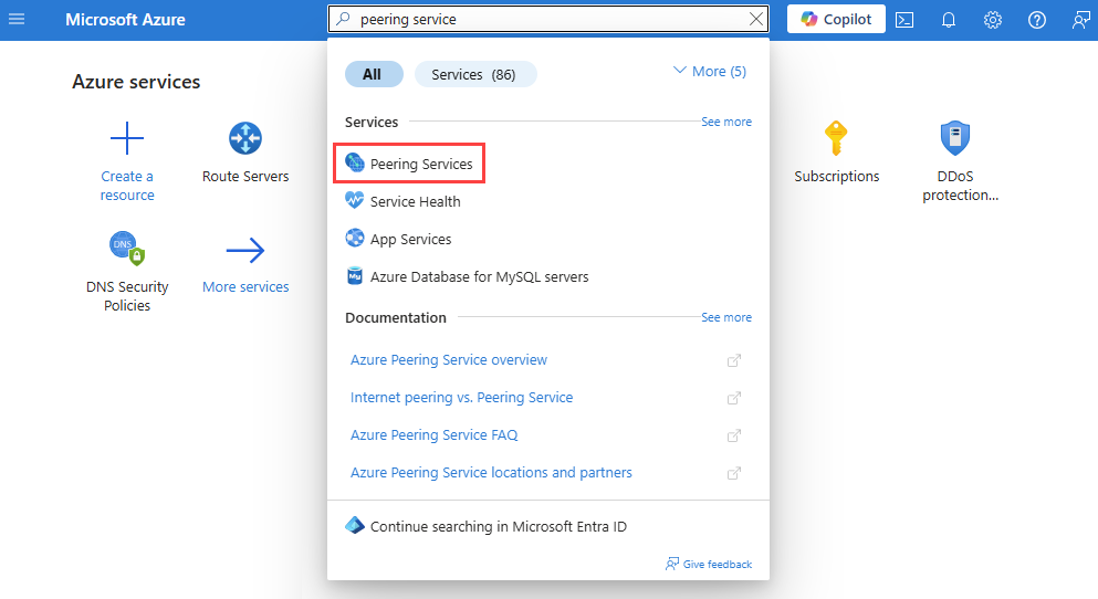 In the search box at the top of the portal, enter Peering Service. Select Peering Services in the search results.