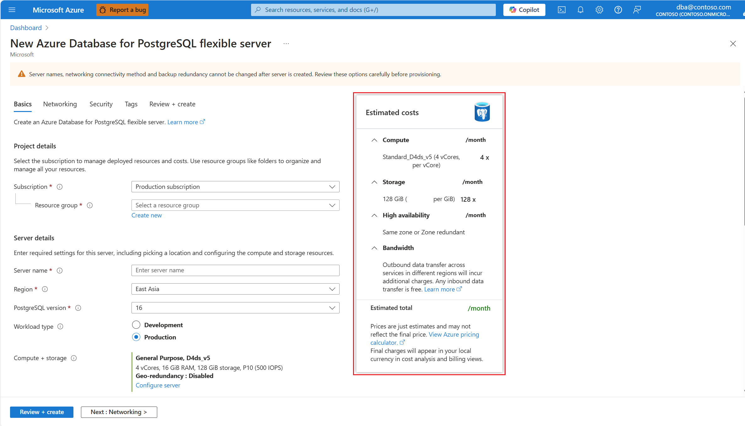 Azure portal also shows you an estimation of the monthly costs of a server configuration, based on the options selected.