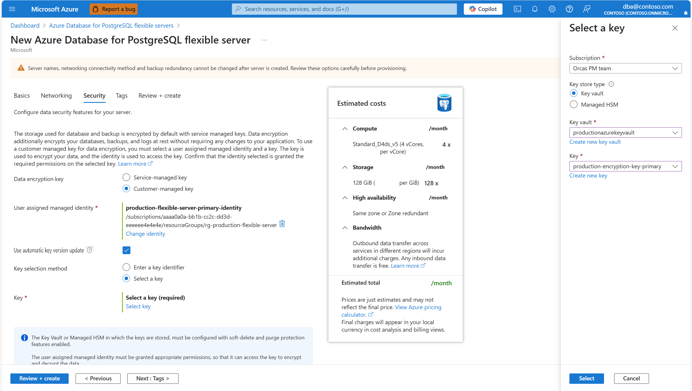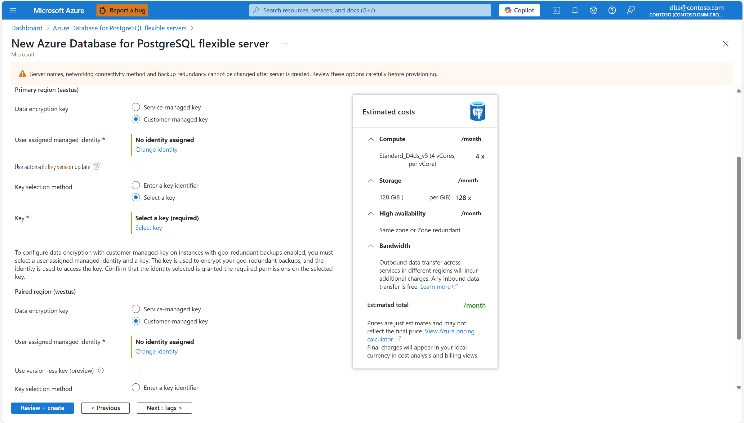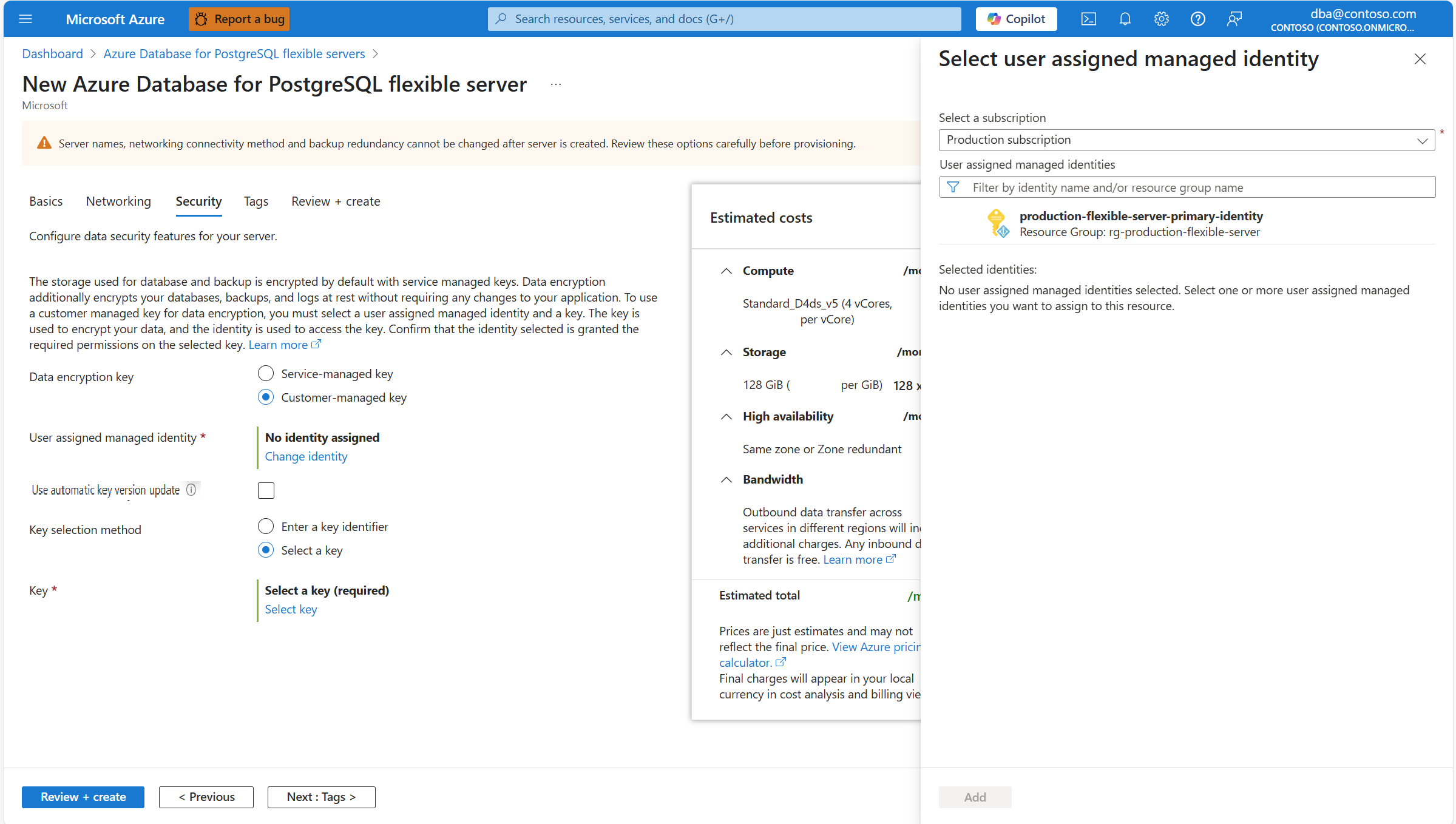 Identities shown in the combo-box are only the ones that your Azure Database for PostgreSQL flexible server instance was assigned. Although it isn't required, to maintain regional resiliency, we recommend that you select user managed identities in the same region as your server. And if your server has geo-backup redundancy enabled, we recommend that the second user managed identity, used to access the data encryption key for geo-redundant backups, exists in the paired region of the server.
