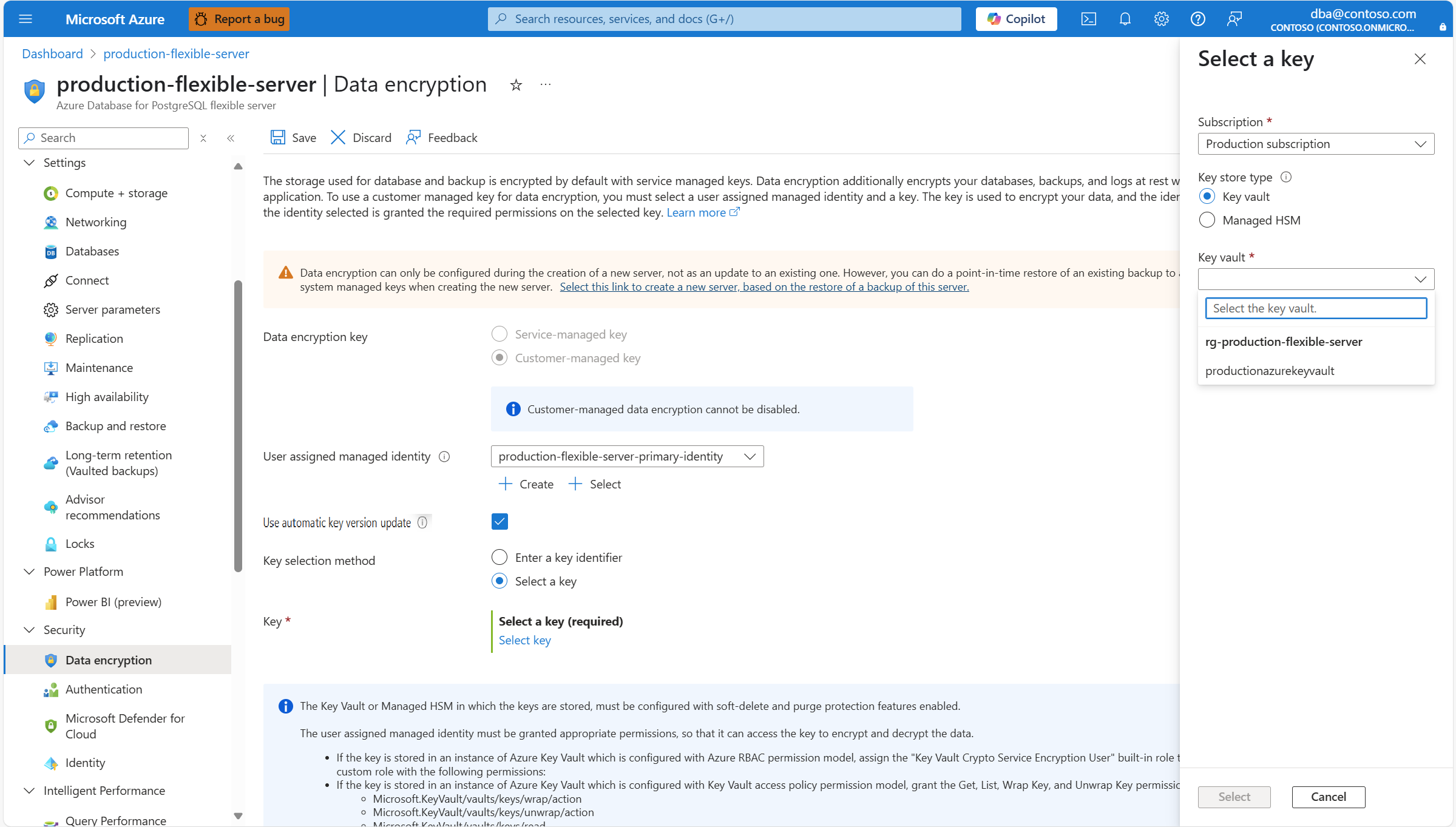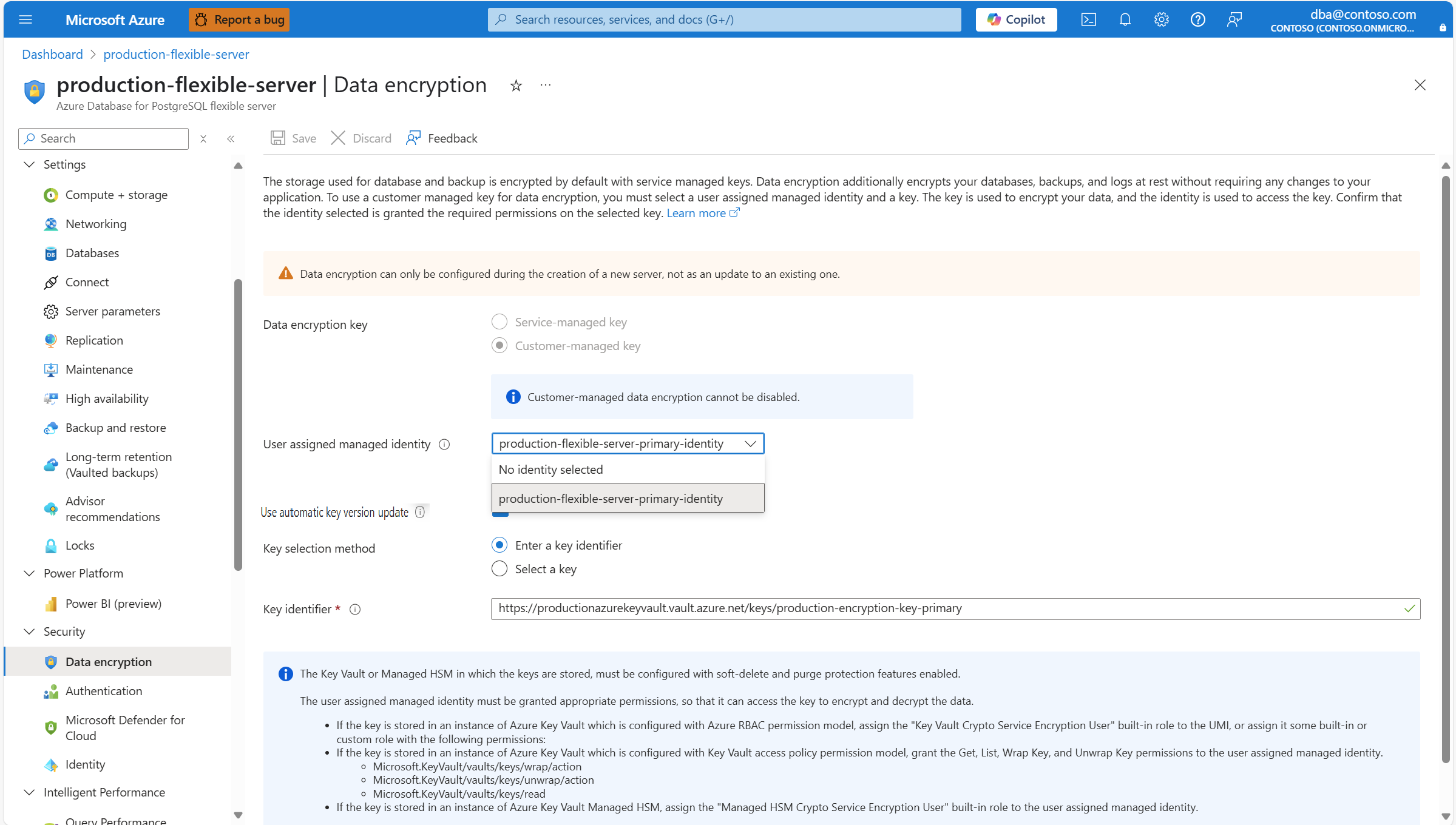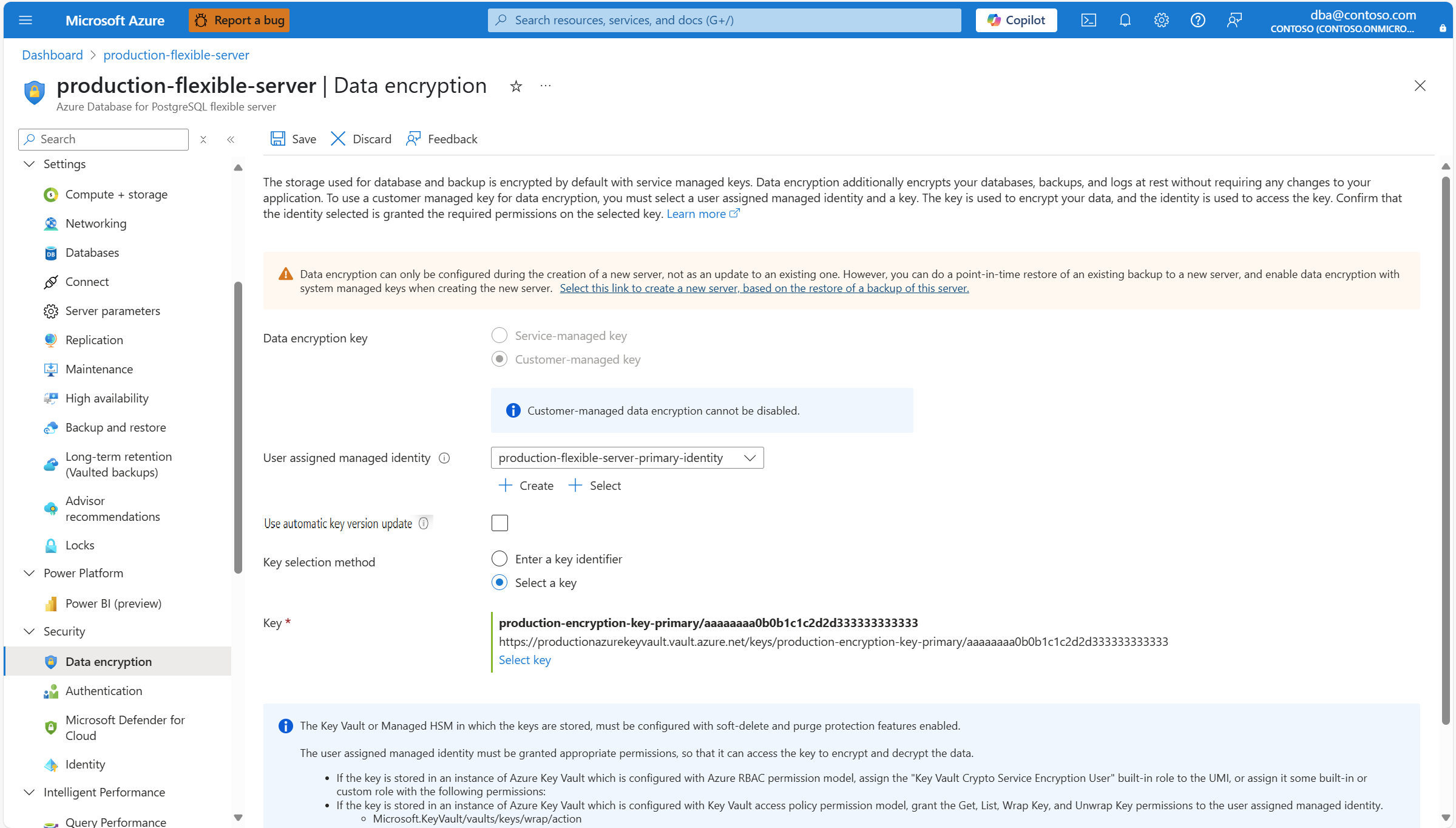 For existing servers that were deployed with data encryption using a customer managed key, you're allowed to do several configuration changes. Things that can be changed are the references to the keys used for encryption, and references to the user assigned managed identities used by the service to access the keys kept in the key stores.