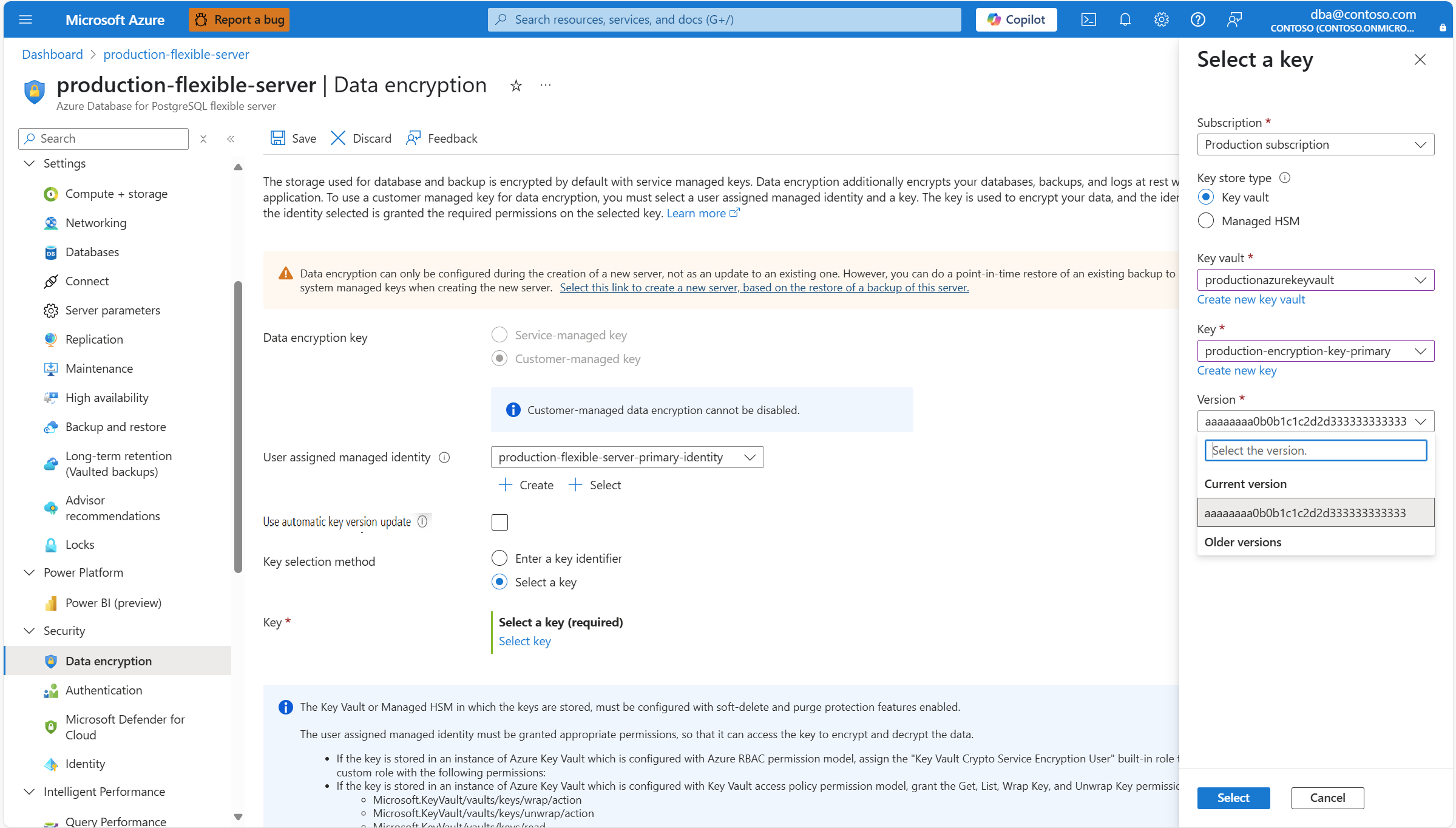 If you rotate the key and don't have Use automatic key version update enabled. Or if you want to use a different key, you must update your Azure Database for PostgreSQL flexible server instance, so that it points to the new key version or new key. To do that, you can copy the resource identifier of the key, and paste it in the Key identifier box.