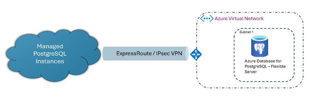 | On-premises with a private IP address via a virtual private network (VPN) or Azure ExpressRoute | Virtual network (VNet)-integrated Azure Database for PostgreSQL flexible server | Yes |