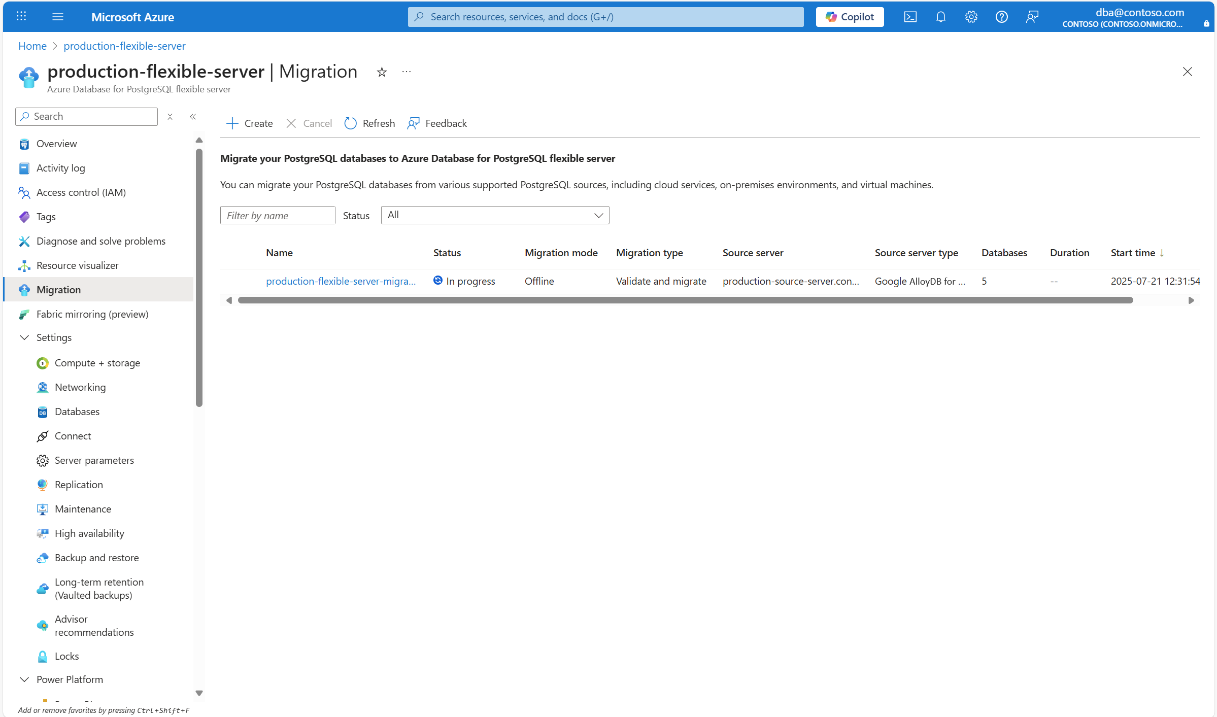 Select Create to go through a wizard-based series of tabs to perform a migration to a flexible server from a Google AlloyDB for PostgreSQL.