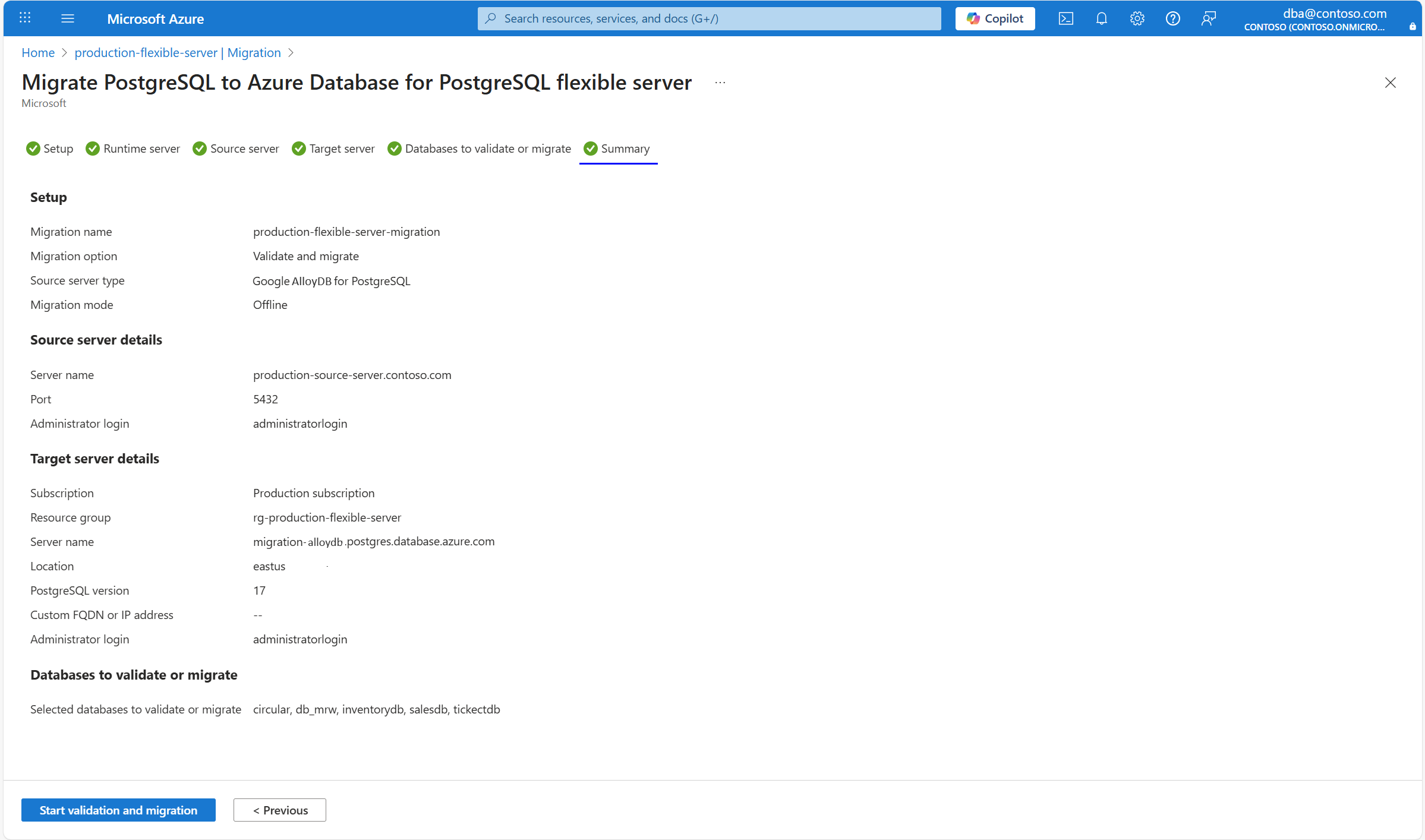 The Summary tab summarizes all the source and target details for creating the validation or migration. Review the details and select Start validation and migration.