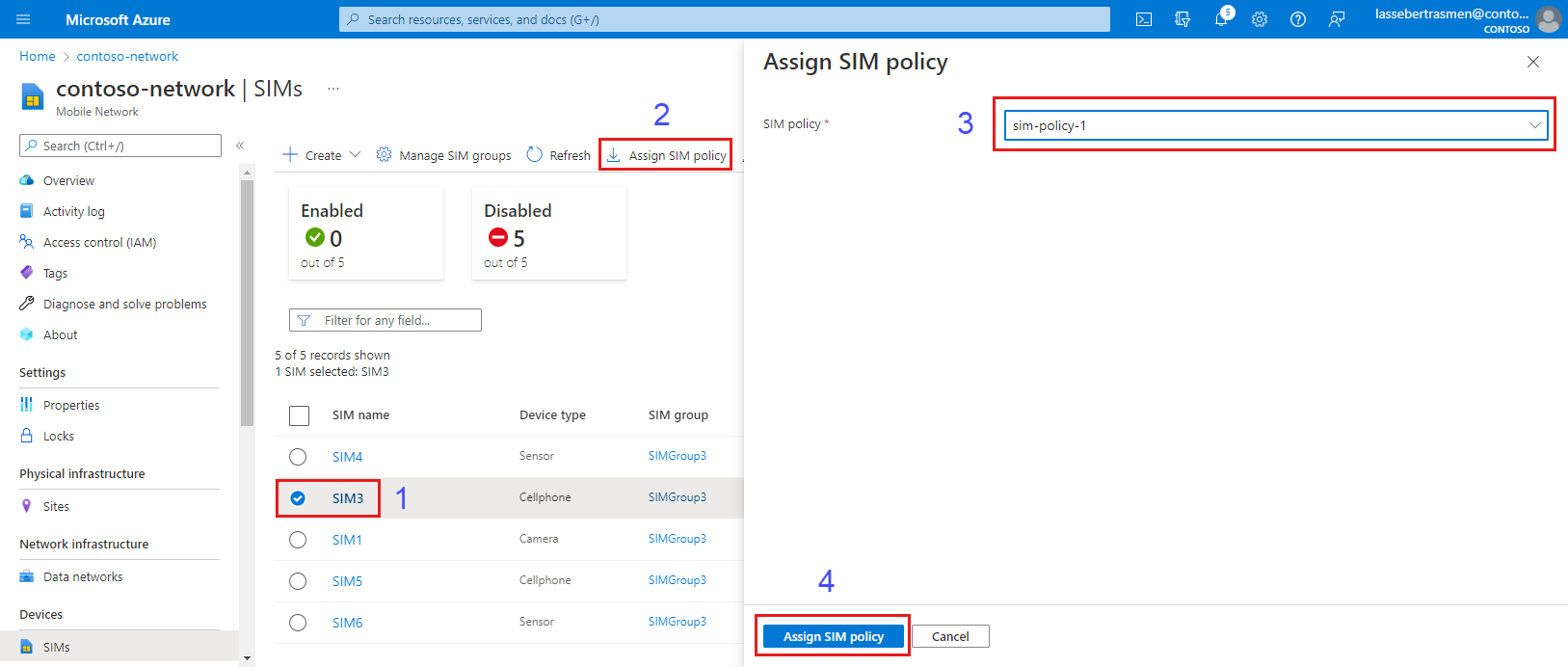 SIMs need an assigned SIM policy before they can use your private mobile network. You might want to assign a SIM policy to an existing SIM that doesn't already have one, or you might want to change the assigned SIM policy for an existing SIM. For information on configuring SIM policies, see Configure a SIM policy.