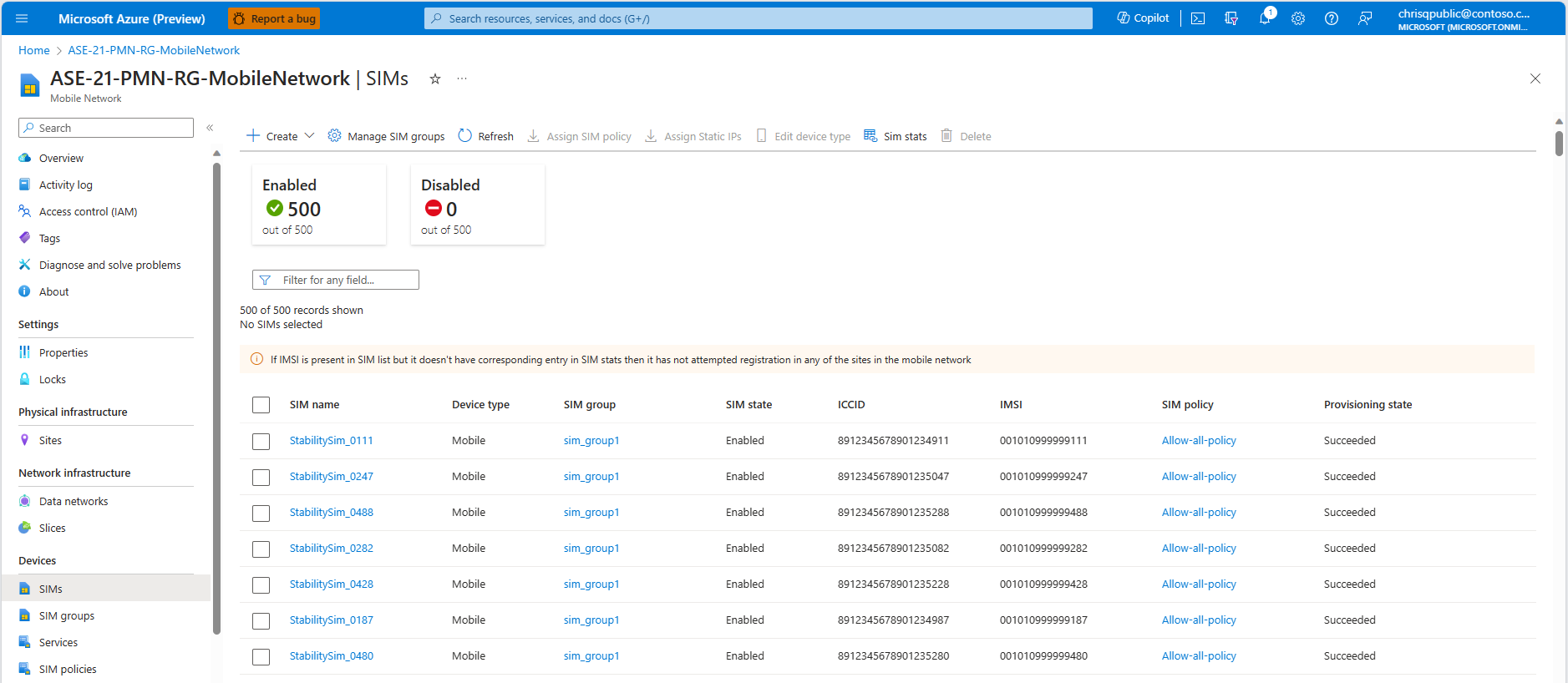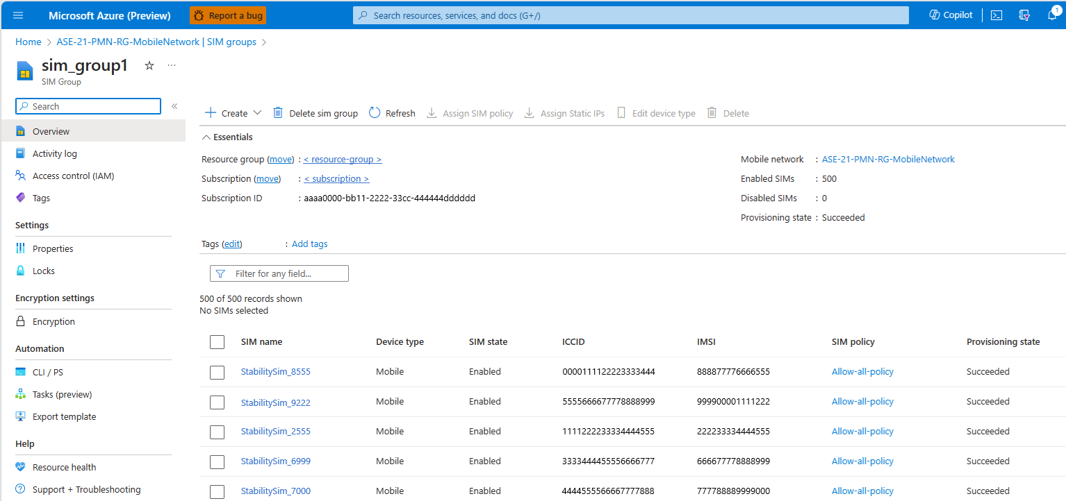 - If you assigned static IP addresses to multiple SIMs, you'll be taken to the resource group containing your private mobile network. Select the Mobile Network resource, and then select SIMs in the resource menu. Check the SIM policy column in the SIMs list to confirm the correct SIM policy has been assigned to your chosen SIMs. You can then select an individual SIM and check the Static IP Configuration section to confirm that the correct static IP address has been assigned to that SIM.
