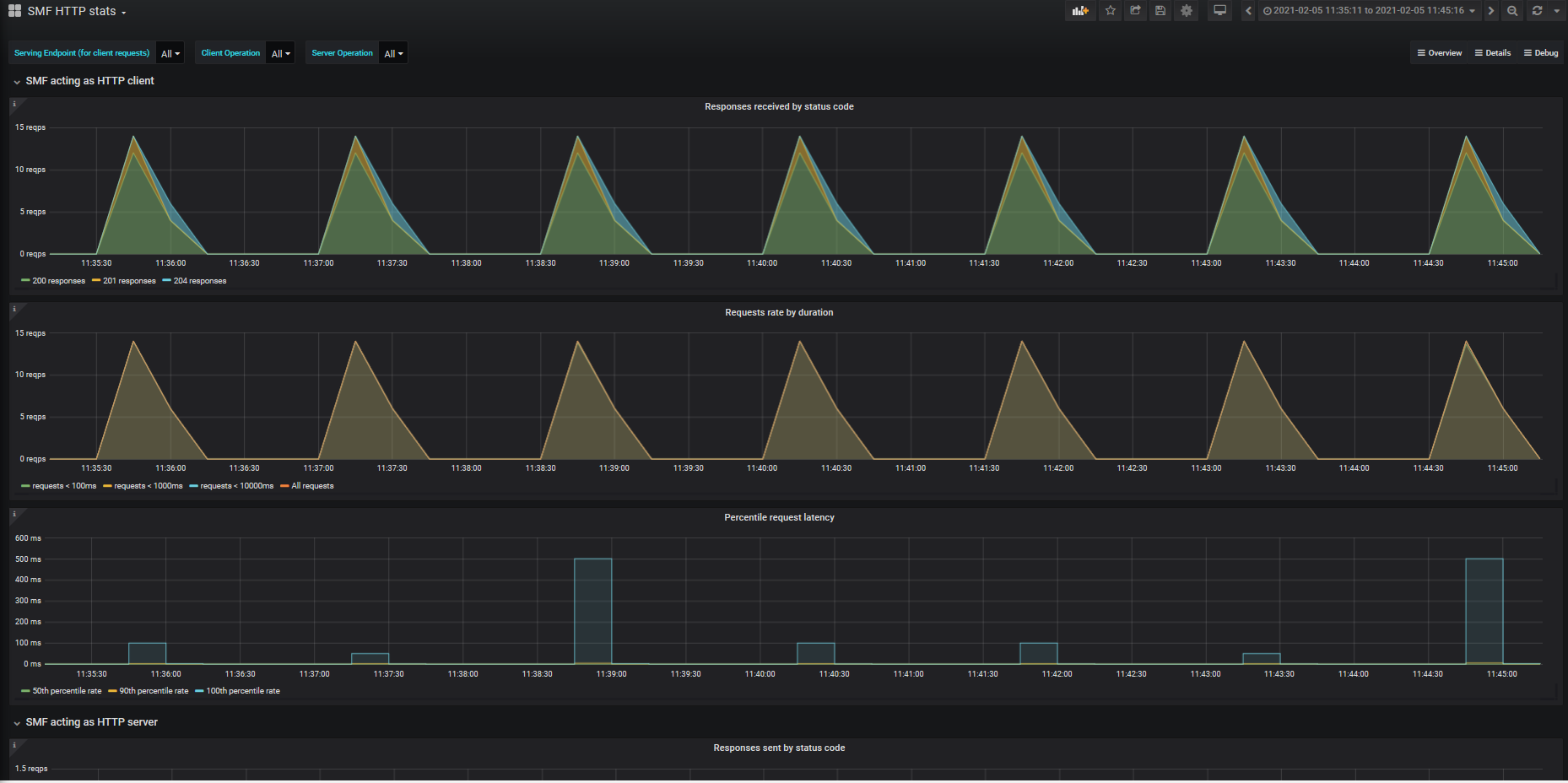 - The HTTP stats dashboard for each network function shows statistics for the HTTP requests and responses shown by that network function. You can use the Serving Endpoint, Client Operation, and Server Operation filters to control which operations are shown.