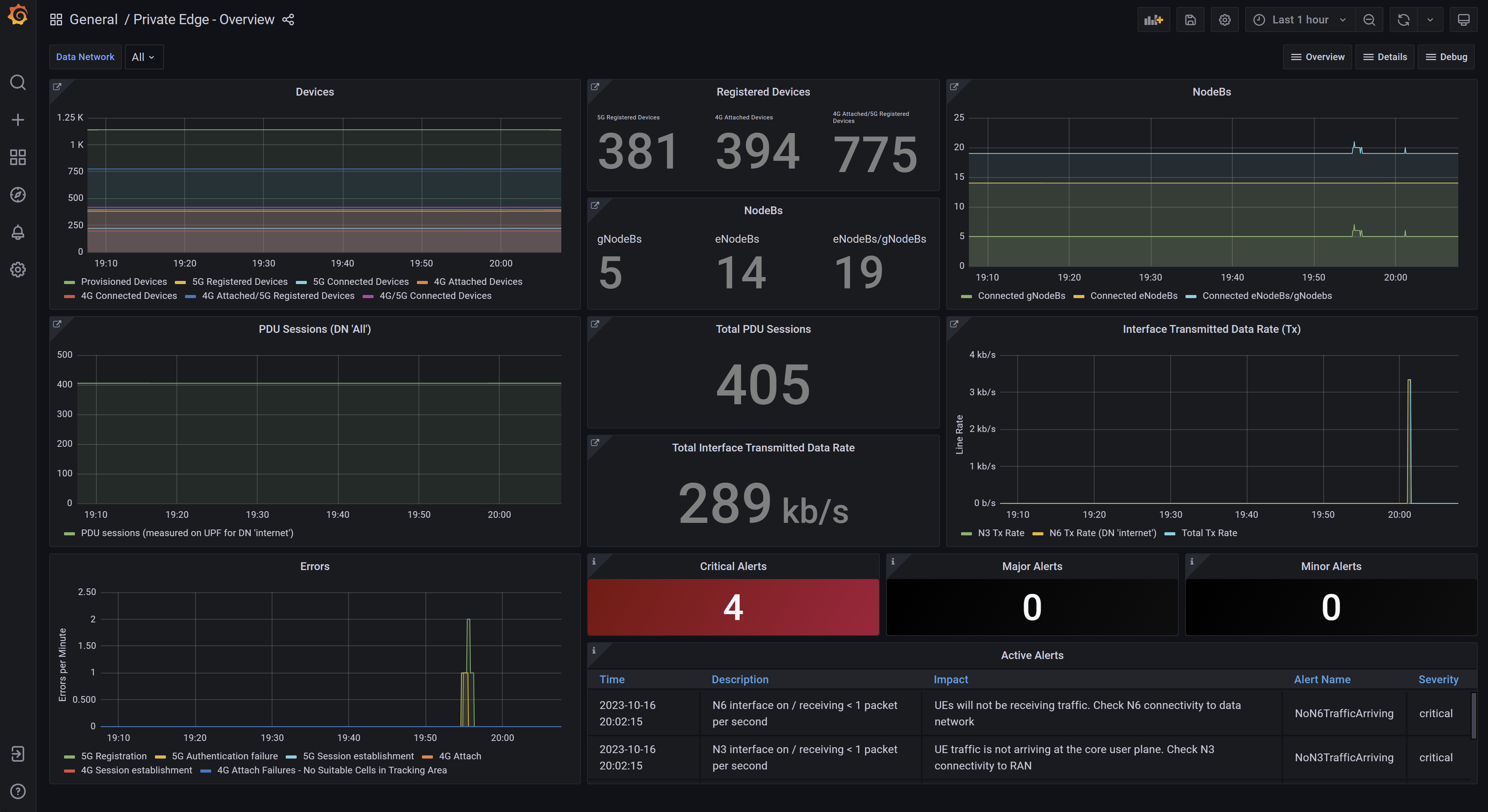 The packet core dashboards provide a flexible way to monitor key statistics relating to your deployment in real time. They also allow you to view information on firing alerts, allowing you to quickly react to emerging issues.
