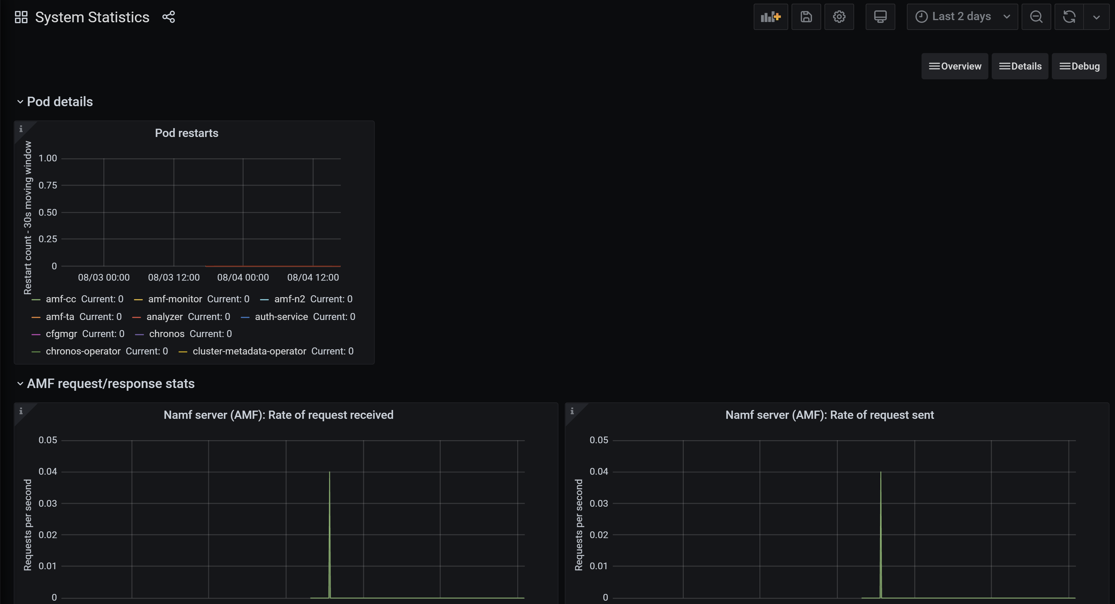 - The System Statistics dashboard contains low-level detail about pod restarts and 5G interface operations.