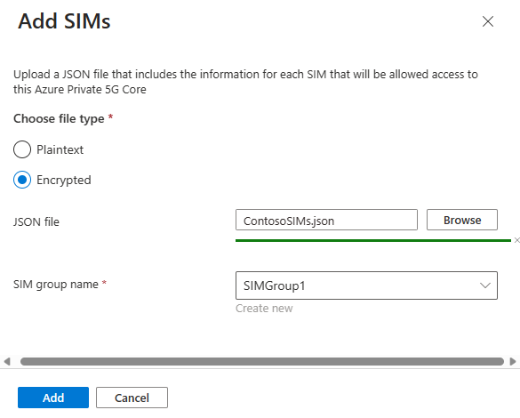 In Add SIMs on the right, select Browse and then select one of the JSON files you created or edited in Create or edit JSON files.