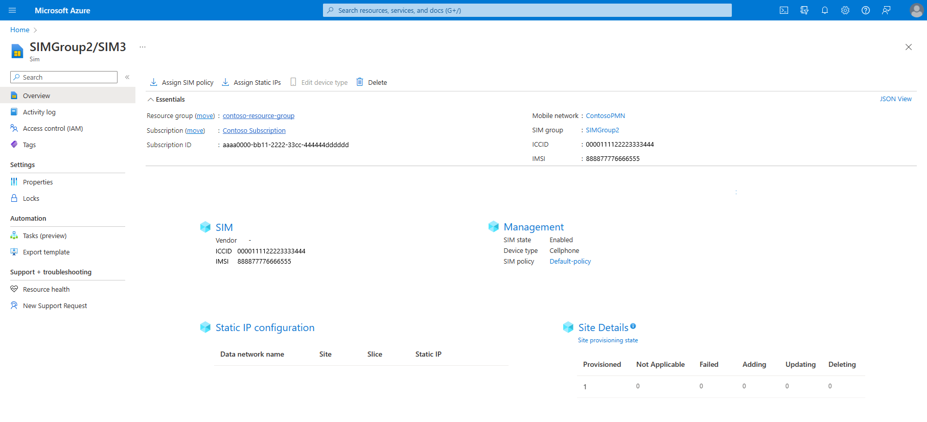 | The SIM policy to assign to the SIM. This is optional, but your SIMs won't be able to use the private mobile network without an assigned SIM policy. | SIM policy | simPolicyId |