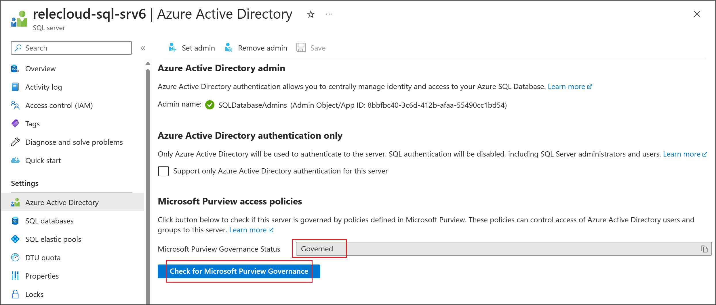 For the logical server associated with Azure SQL Database to honor policies from Microsoft Purview, you need to configure a Microsoft Entra admin. In the Azure portal, go to the logical server that hosts the Azure SQL Database instance. On the side menu, select Microsoft Entra ID. Set an admin name to any Microsoft Entra user or group that you prefer, and then select Save.