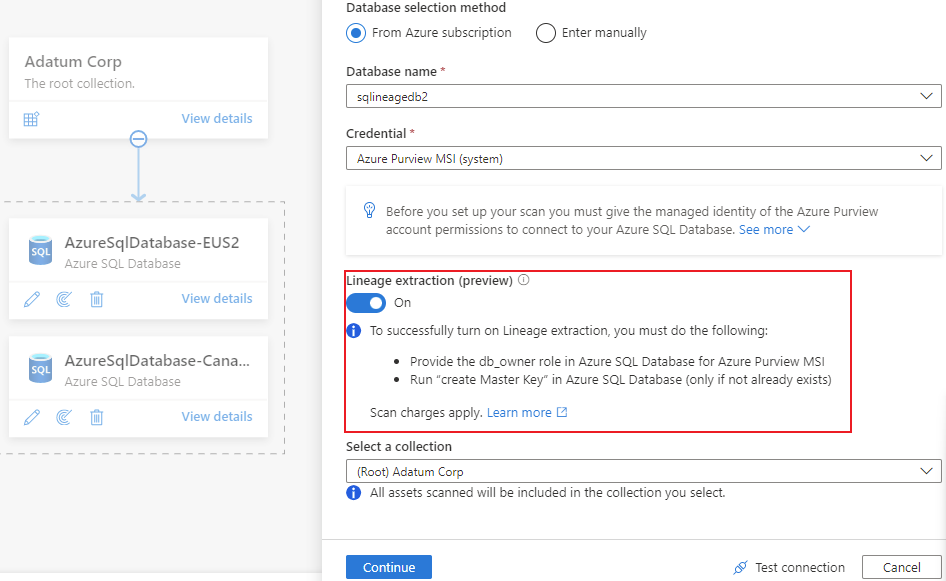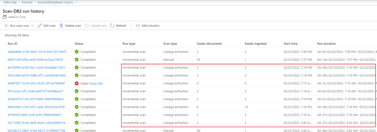 After you successfully set up the scan, a new scan type called Lineage extraction will run incremental scans every six hours to extract lineage from Azure SQL Database. Lineage is extracted based on the stored procedure runs in the SQL database.