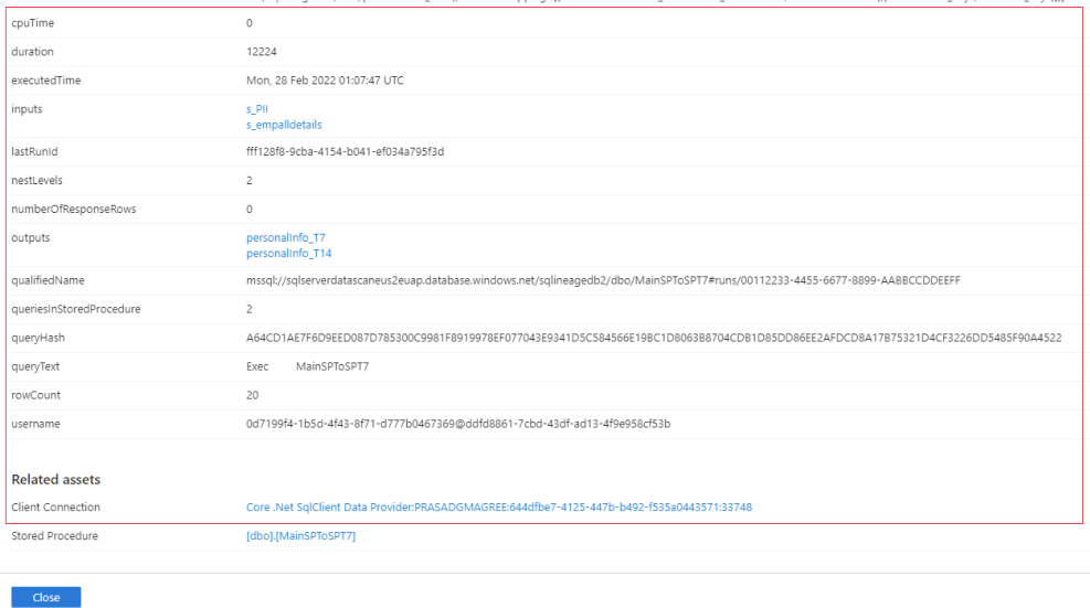 Select the stored procedure hyperlink next to Runs to see the Azure SQL Stored Procedure Run overview. Go to the Properties tab to see enhanced runtime information from the stored procedure, such as executedTime, rowCount, and Client Connection.