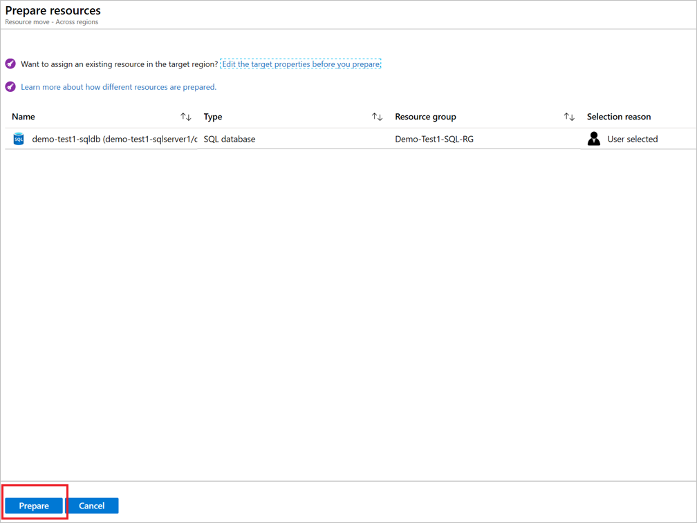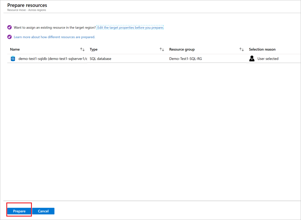In Across regions, select the database (demo-test2-sqldb in our walkthrough), and then select Prepare.