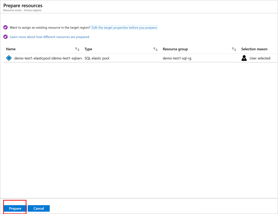 In Across regions, select the source elastic pool (demo-test1-elasticpool in our walkthrough), and select Prepare.