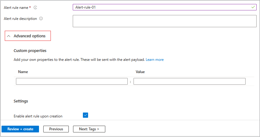 Here you can select Advanced options to set up your own Custom properties to the alert.
