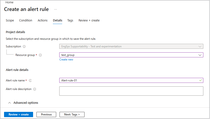 On the Details tab, you set up the details of the project by Subscription and Resource group. Then define the Alert rule name for the alert and add a description for more clarifications if needed.