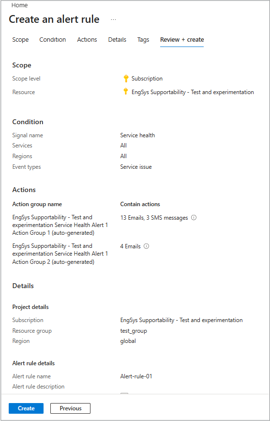 - Select Create to finish the alert, or if you want to add more detailed information for the service health alert, select Advanced Options to add more information to your alert.