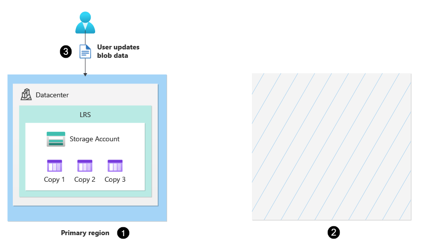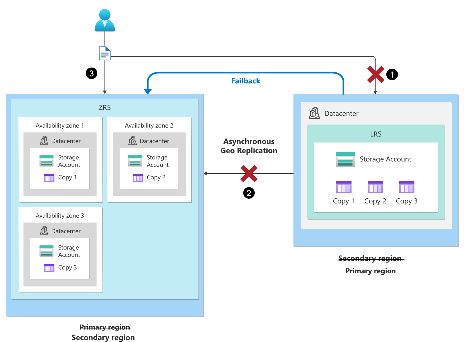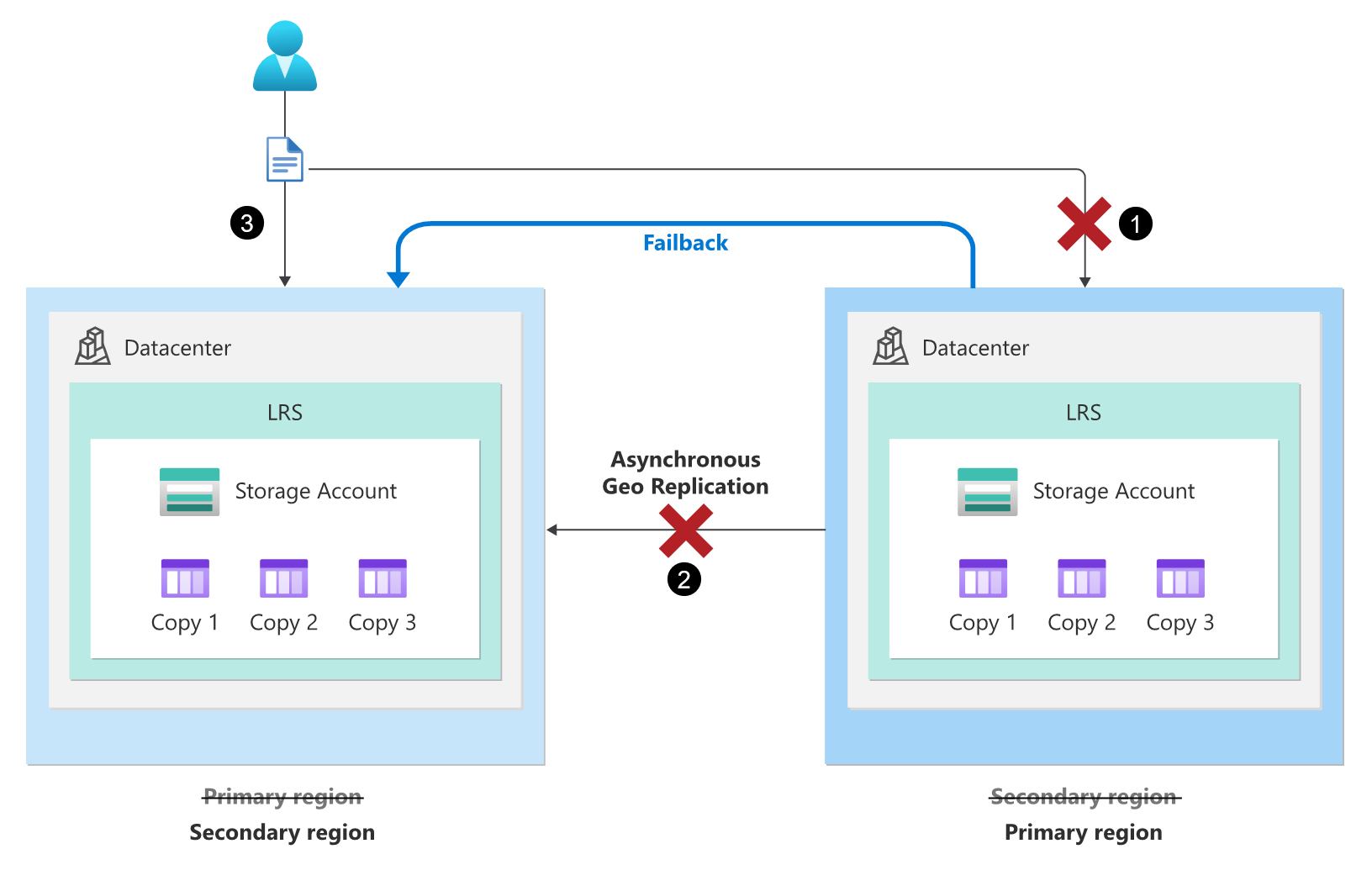 After the failback is complete, the original primary region becomes the current one again (1), and the copy of the storage account in the original secondary is deleted (2). The storage account is configured as locally redundant in the primary region, and is no longer geo-redundant. Users can resume writing data to the storage account (3), as shown in this image:
