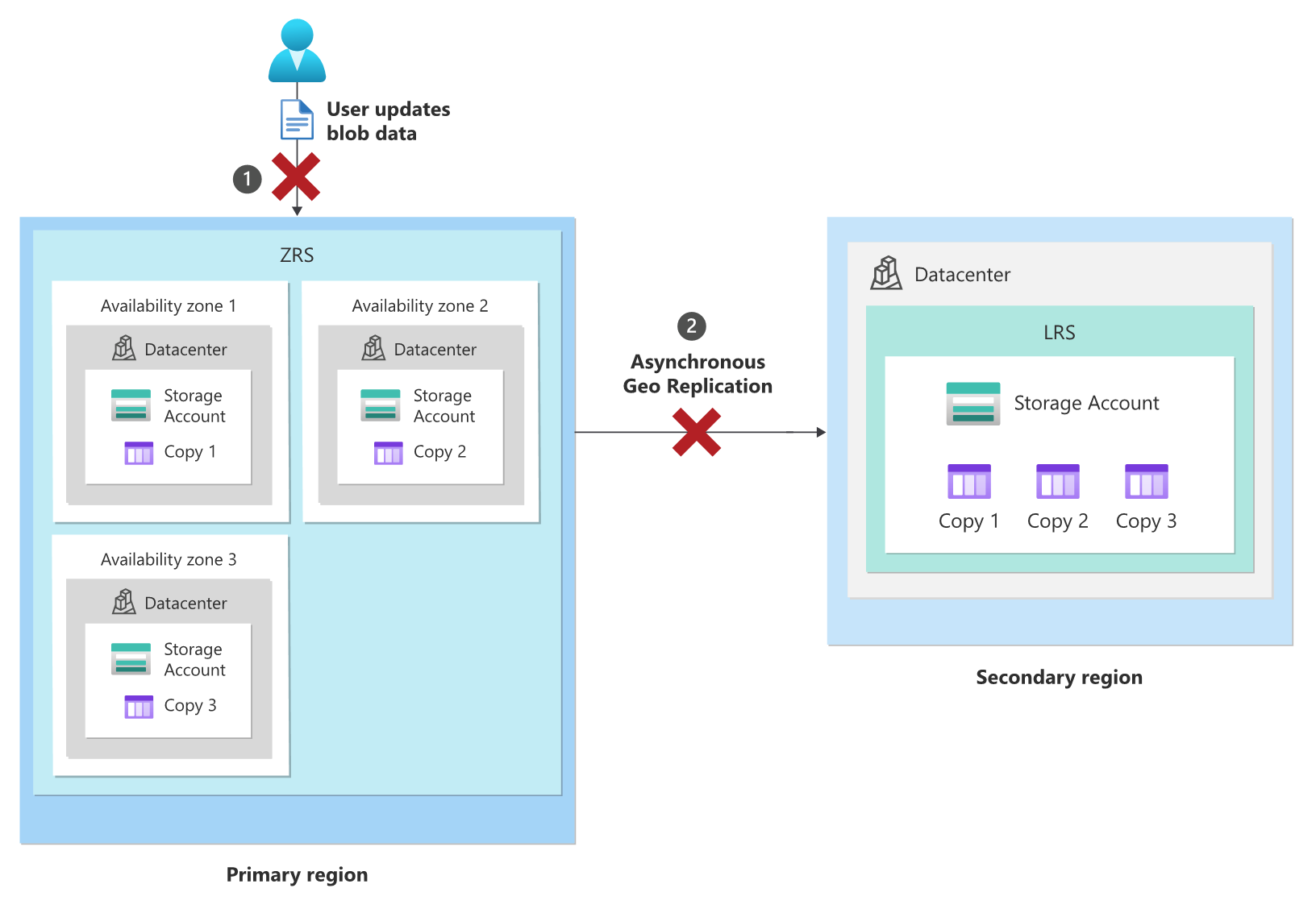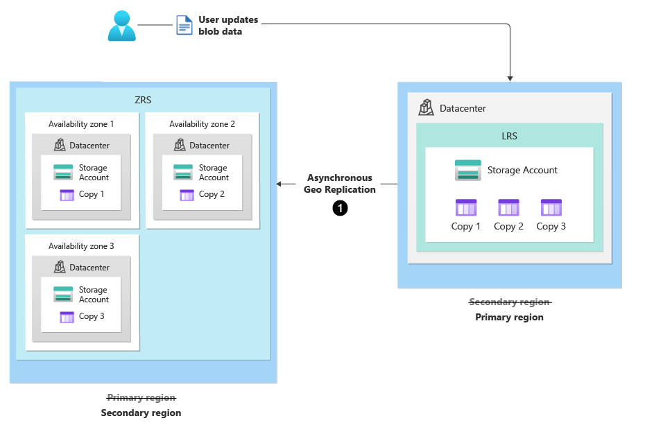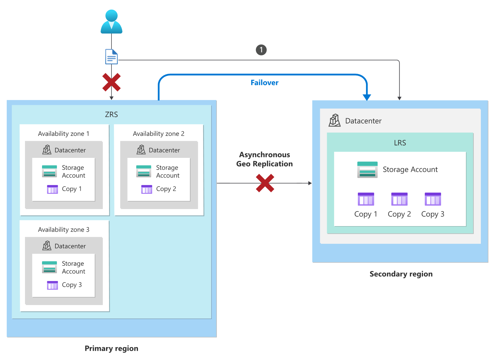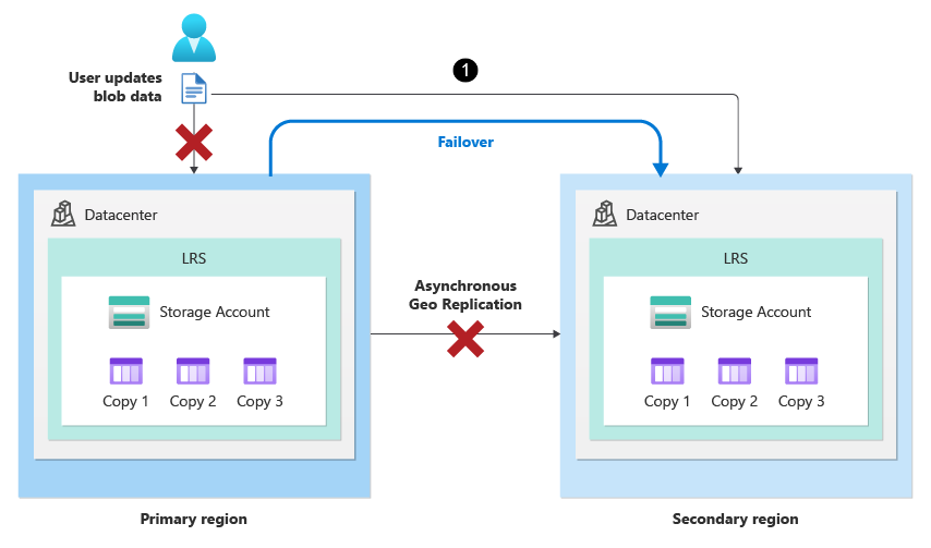 Under normal circumstances, a client writes data to a storage account in the primary region via storage service endpoints (1). The data is then copied asynchronously from the primary region to the secondary region (2). The following image shows the normal state of a storage account configured as GRS when the primary endpoints are available: