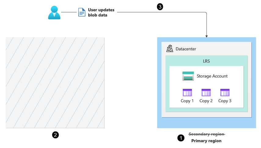 After the failover is complete, the original secondary becomes the new primary (1), and the copy of the storage account in the original primary is deleted (2). The storage account is configured as LRS in the new primary region, and is no longer geo-redundant. Users can resume writing data to the storage account (3), as shown in this image: