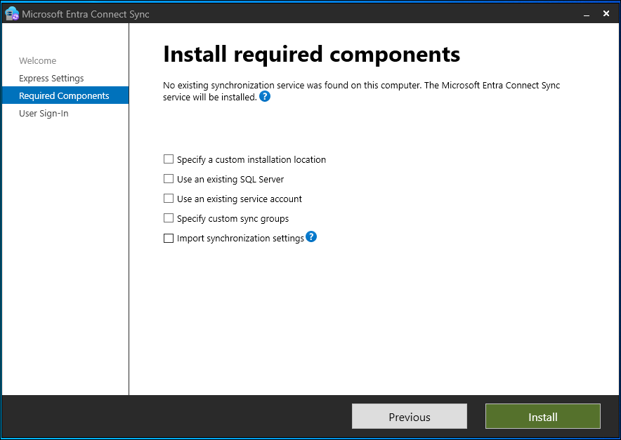 | Specify custom sync groups | By default, when the synchronization services are installed, Microsoft Entra Connect creates four groups that are local to the server. These groups are Administrators, Operators, Browse, and Password Reset. You can specify your own groups here. The groups must be local on the server. They can't be located in the domain. |