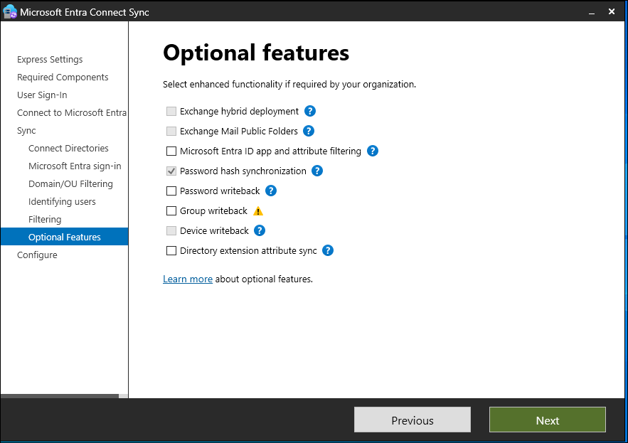 If Azure AD Sync or Direct Synchronization (DirSync) are active, don't activate any writeback features in Microsoft Entra Connect.